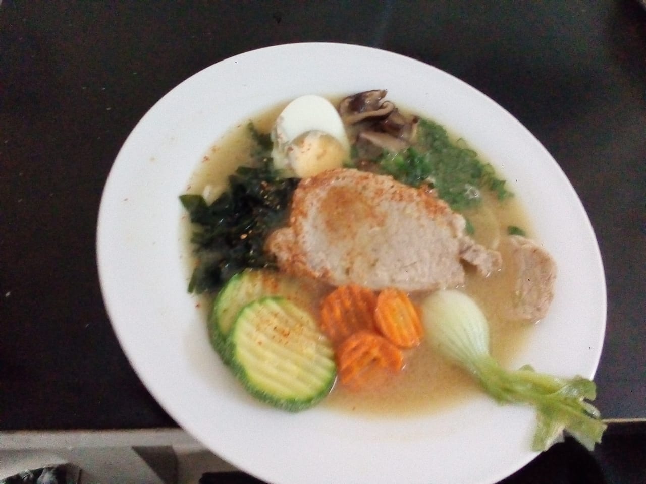 Pasta japonesa preparada en fondo de miso, shitake con almeja, calamar, pescado y camarón.