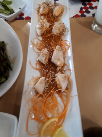 Calamar baby relleno de pasta momiji servido con salsa dulce.