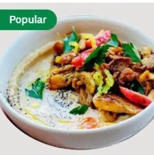 Puré de garbanzo humectado con aceite de oliva, acompañado con una hoja de pan pita al horno, con pollo especiado al curry y selección de especies del medio oriente, 180 gr.
