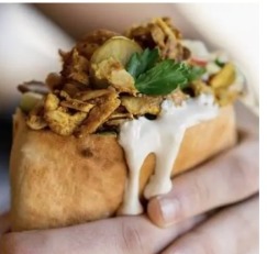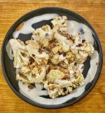Coliflor dorada, bañada en salsa tahini (de ajonjolí) con almendra fileteada tostada encima de la cama de puré de garbanzo con chipotle, humectado con aceite de oliva, acompañado con una hoja de pan pita al horno. 180 gr.