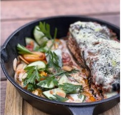 Hojuelas de berenjena en salsa bolognesa con cremoso de ajo y ensalada verde. 250 gr.