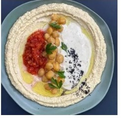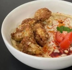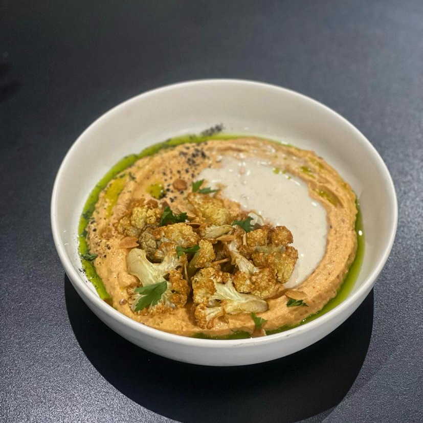 Puré de garbanzo humectado con aceite de oliva, acompañado con una hoja de pan pita al horno, encima coliflor dorada, bañada en salsa tahini (de ajonjolí) con almendra fileteada tostada, 180 gr.