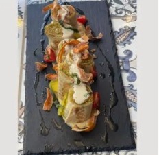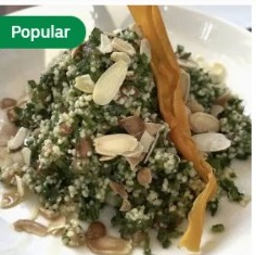 Fina ensalada de hierbas y jitomate, cuidadosamente integrada con couscous, coronada con almendra fileteada. 120 gr.