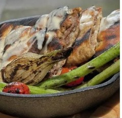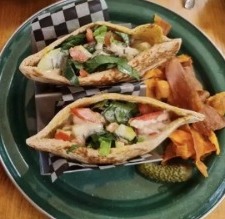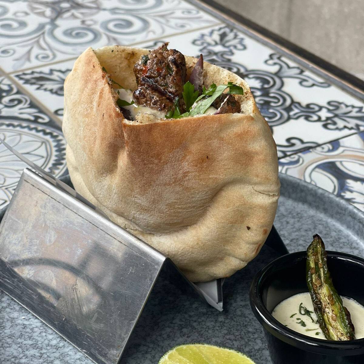 Pan pita relleno de kabab (brocheta de carne de res premium especiada al grill) y verdura asada estilo armenio. 220 gr.