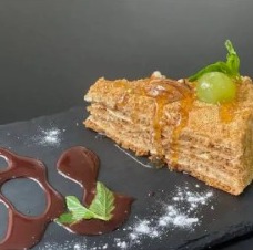 Una rebanada de delicioso pastel de miel de Rusia, que preserva la tradición de gran Pakhlavá de Constantinopla. 120 gr.