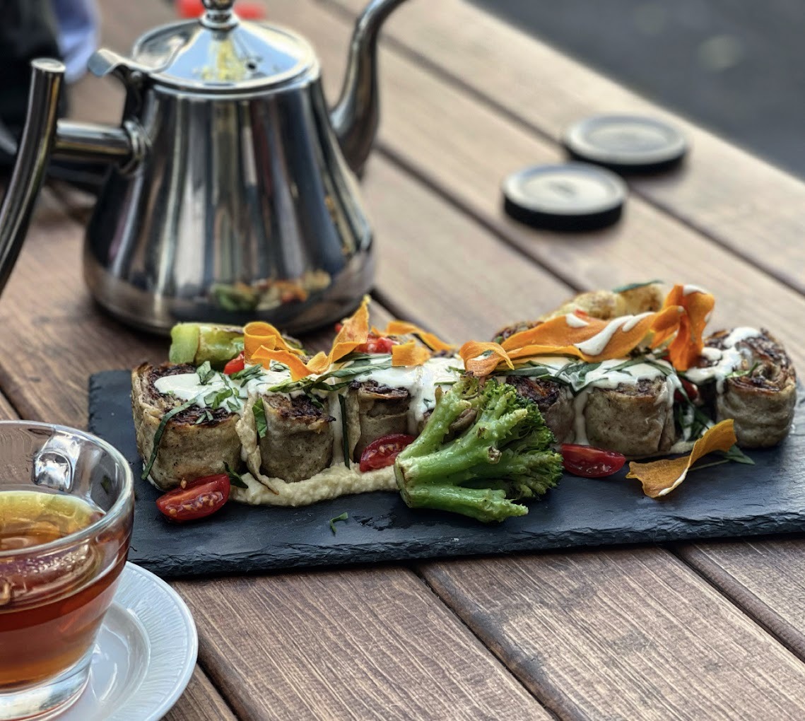 Fino rollo de pan ancestral árabe envuelto con una capa de kabab, es preparado al grill y servido en concepto plant food, 250 gr.