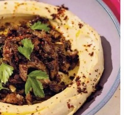 Puré de garbanzo humectado con aceite de oliva, acompañado con una hoja de pan pita al horno, con res selecta sazonada con curry y selección de especies del medio oriente, 180 gr.