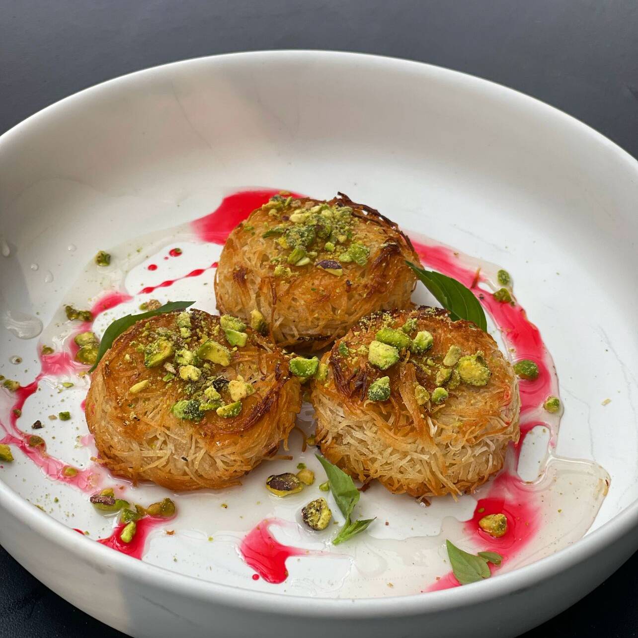 Postre de masa de sémola con queso, un jarabe de limón aromático y pistaches. 80 gr.
