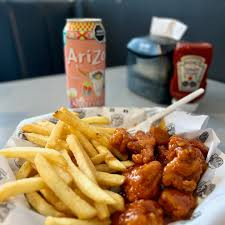 Orden de Boneless de pechuga de pollo bañados en salsa Buffalo, con una porción de papás a la francesa.