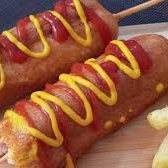 Salchicha capeada con una porción de papas a la francesa. Queso, catsup, mayonesa y salsa por aparte.