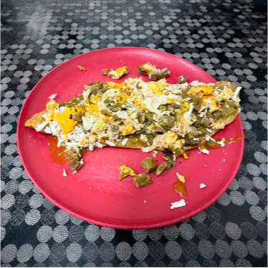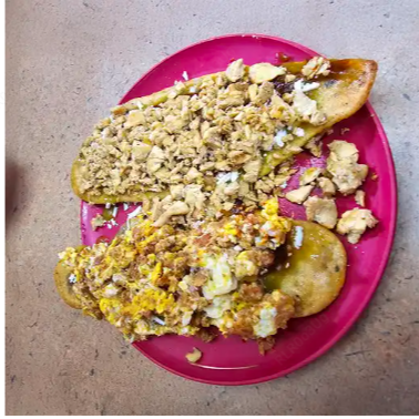 Huarache con huevo relleno de frijoles caseros, acompañado de salsa a elegir, cebolla y queso fresco.
