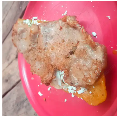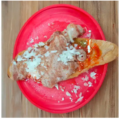 Huarache con costilla y queso relleno de frijoles caseros, acompañado de salsa a elegir con cebolla y queso fresco.