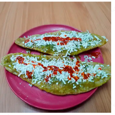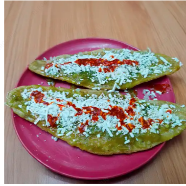 Huarache con nopales relleno de frijoles caseros, acompañado de salsa a elegir, cebolla y queso fresco.