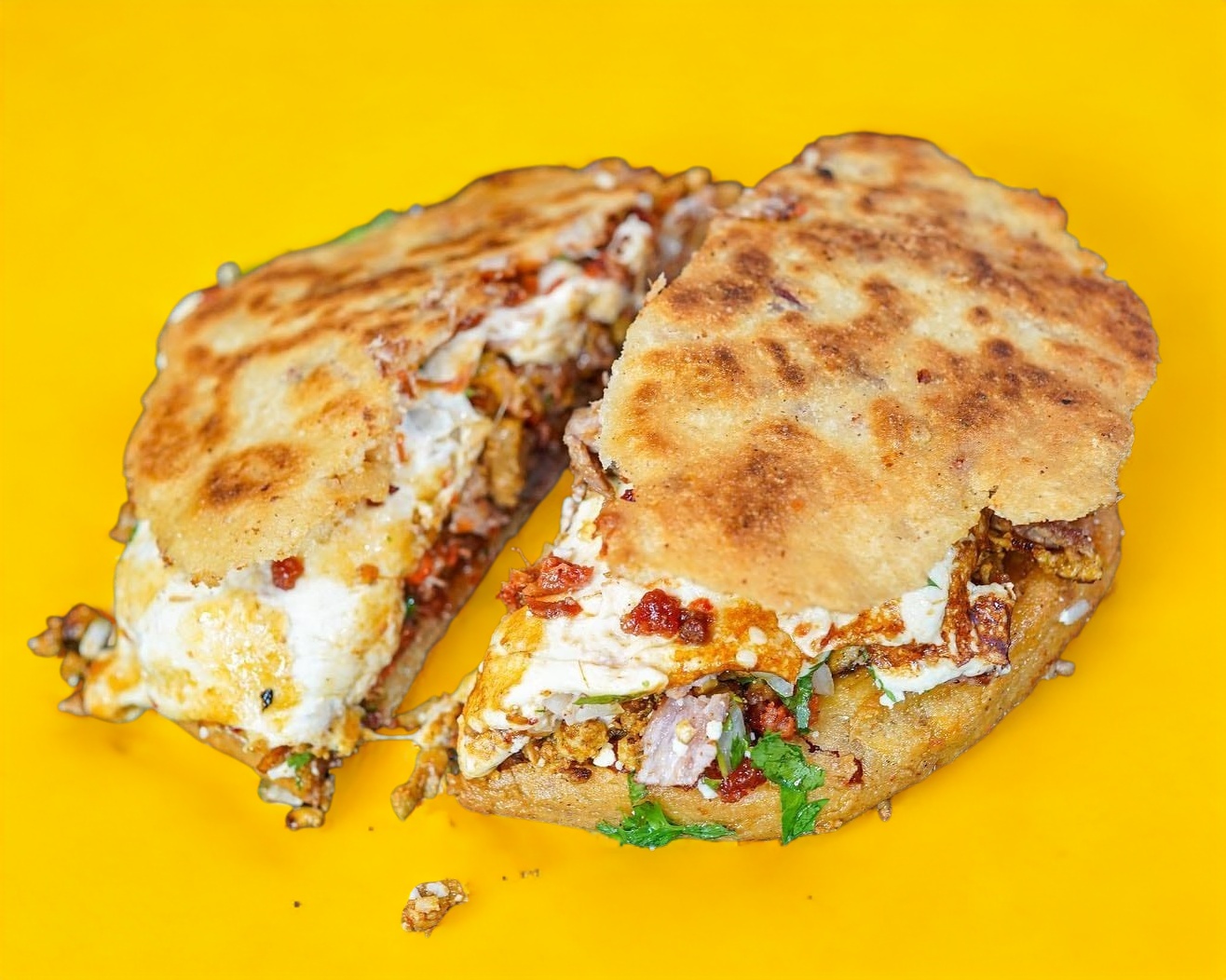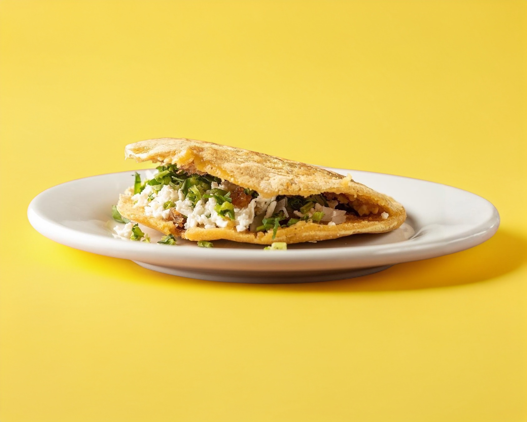 Gordita de masa de maíz, rellena de chicharrón prensado, frita en aceite y acompañada de un guisado de tu elección, salsa, queso y lechuga.