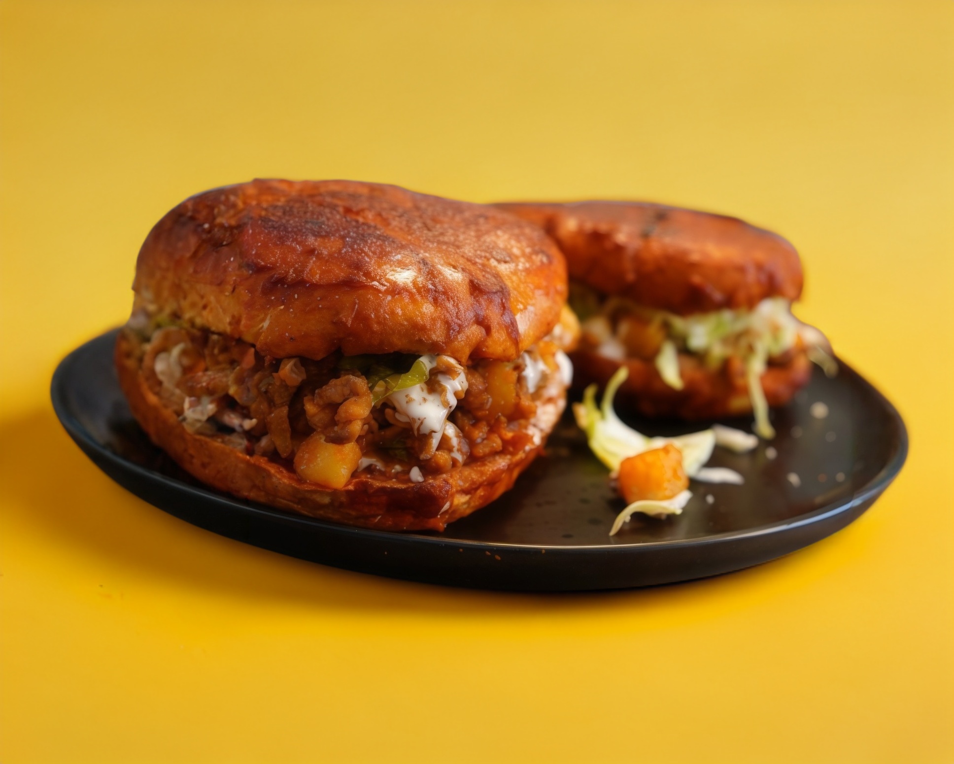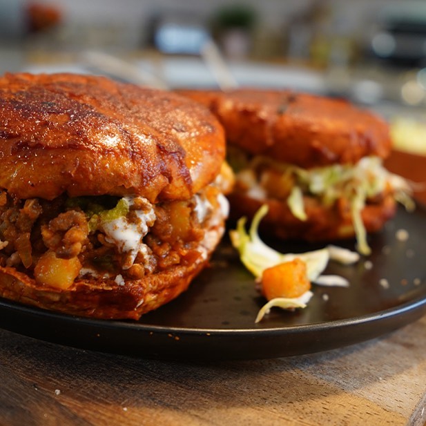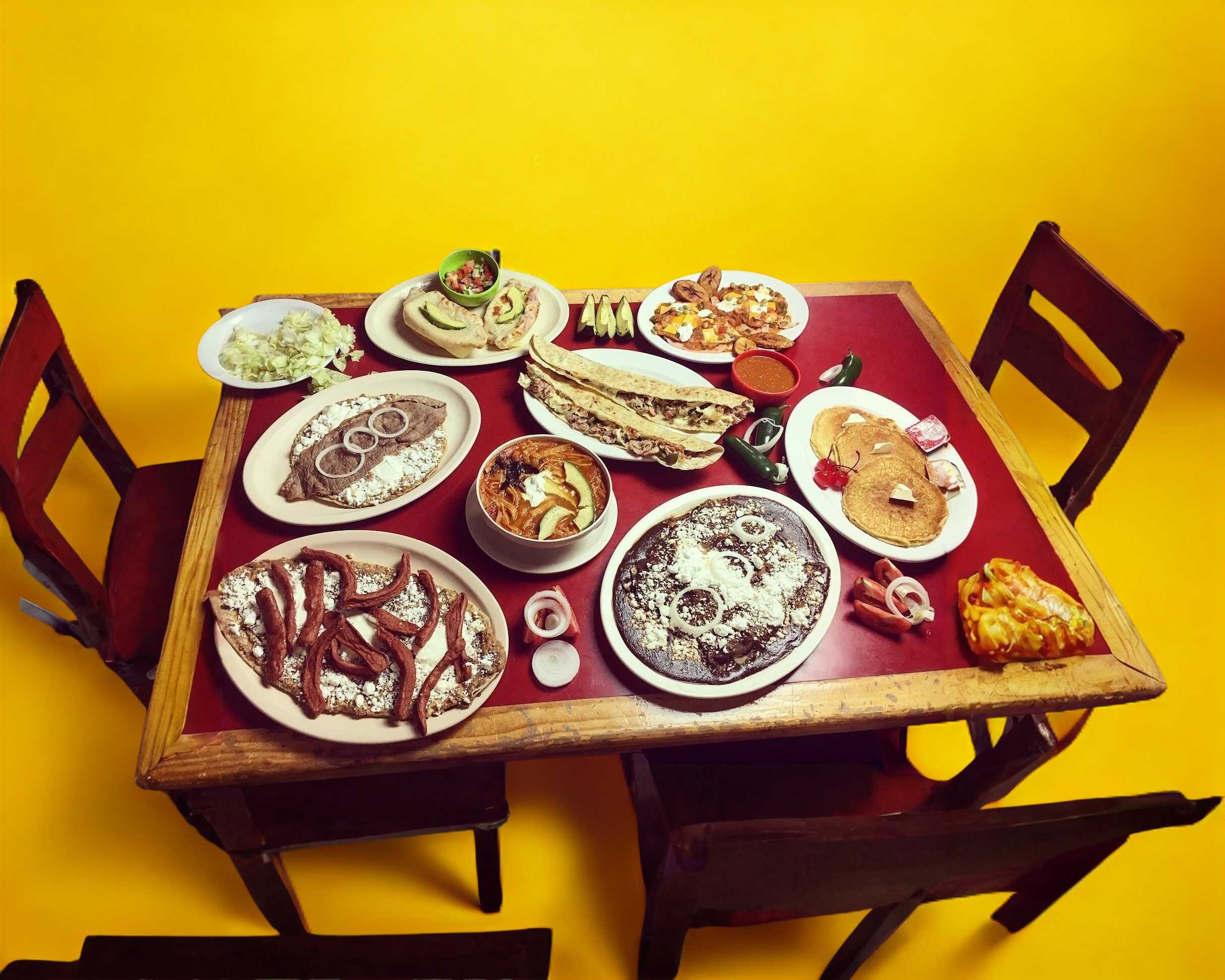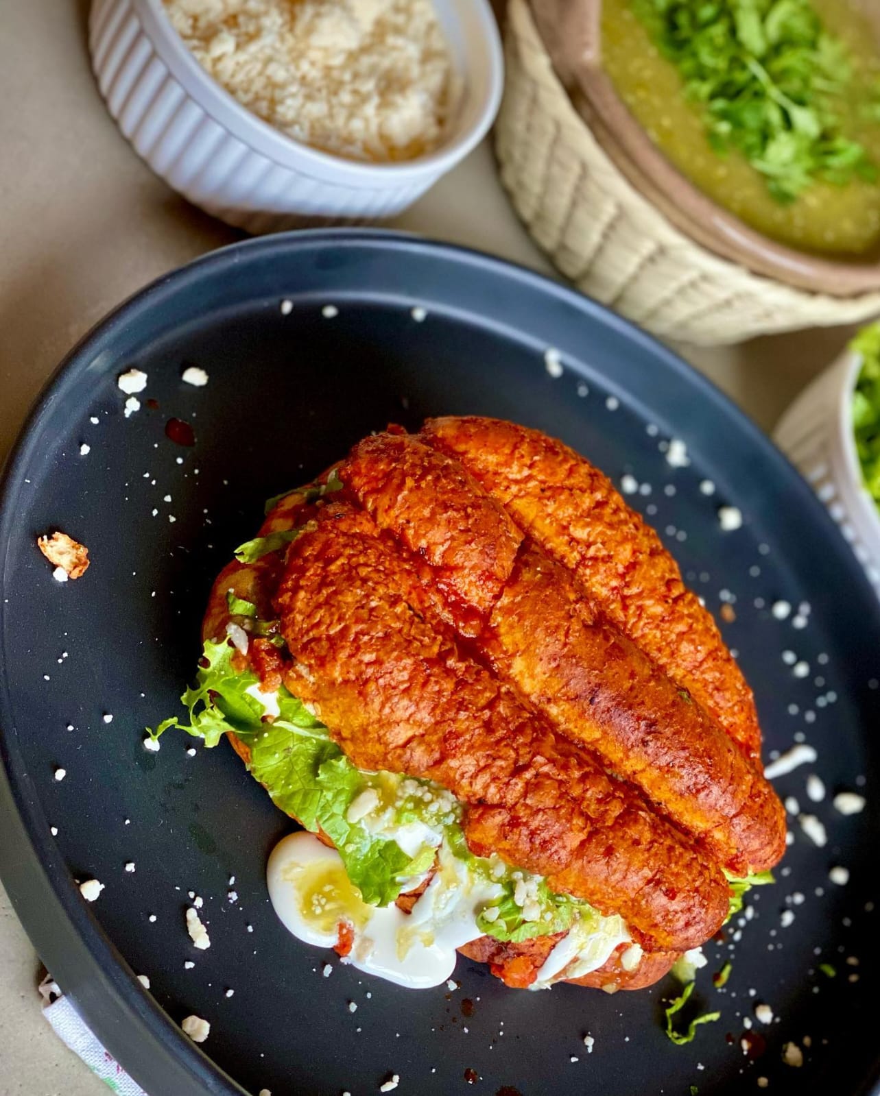 Telera bañada en chile guajillo, frita en comal, rellena del guisado de tu elección.