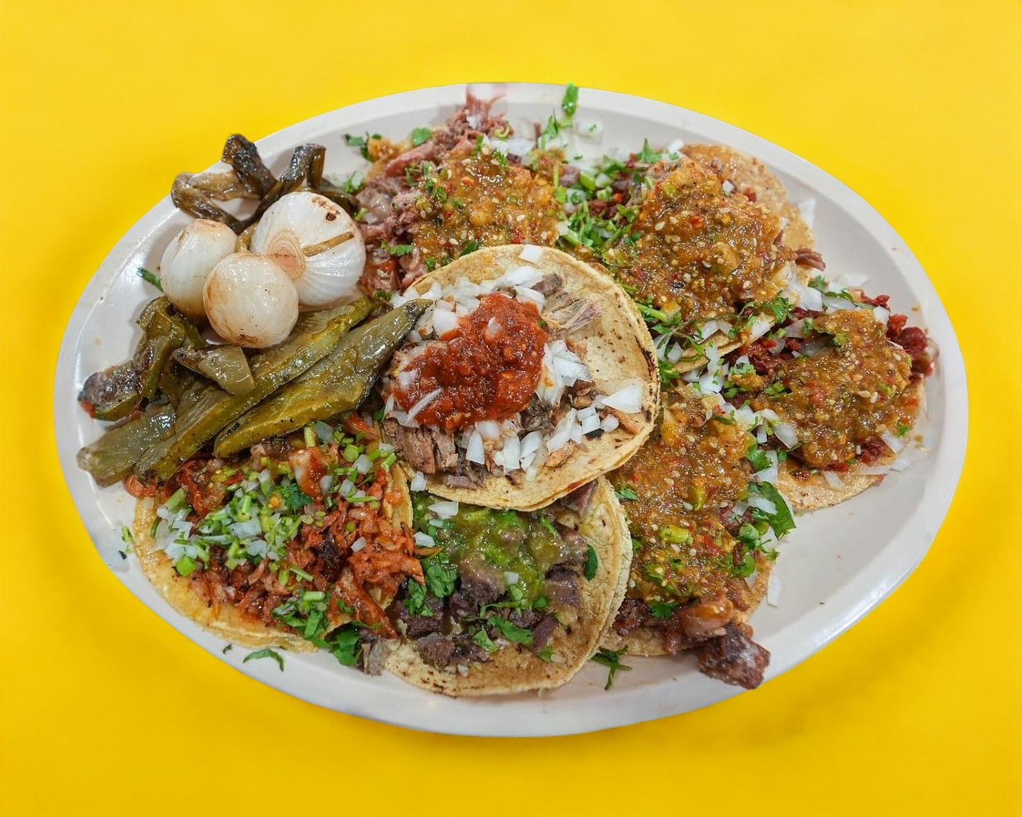 Tortilla de maíz ( 1 pieza), acompañada de la carne de tu elección 70 gramos aprox, verduras y salsa verde y roja.