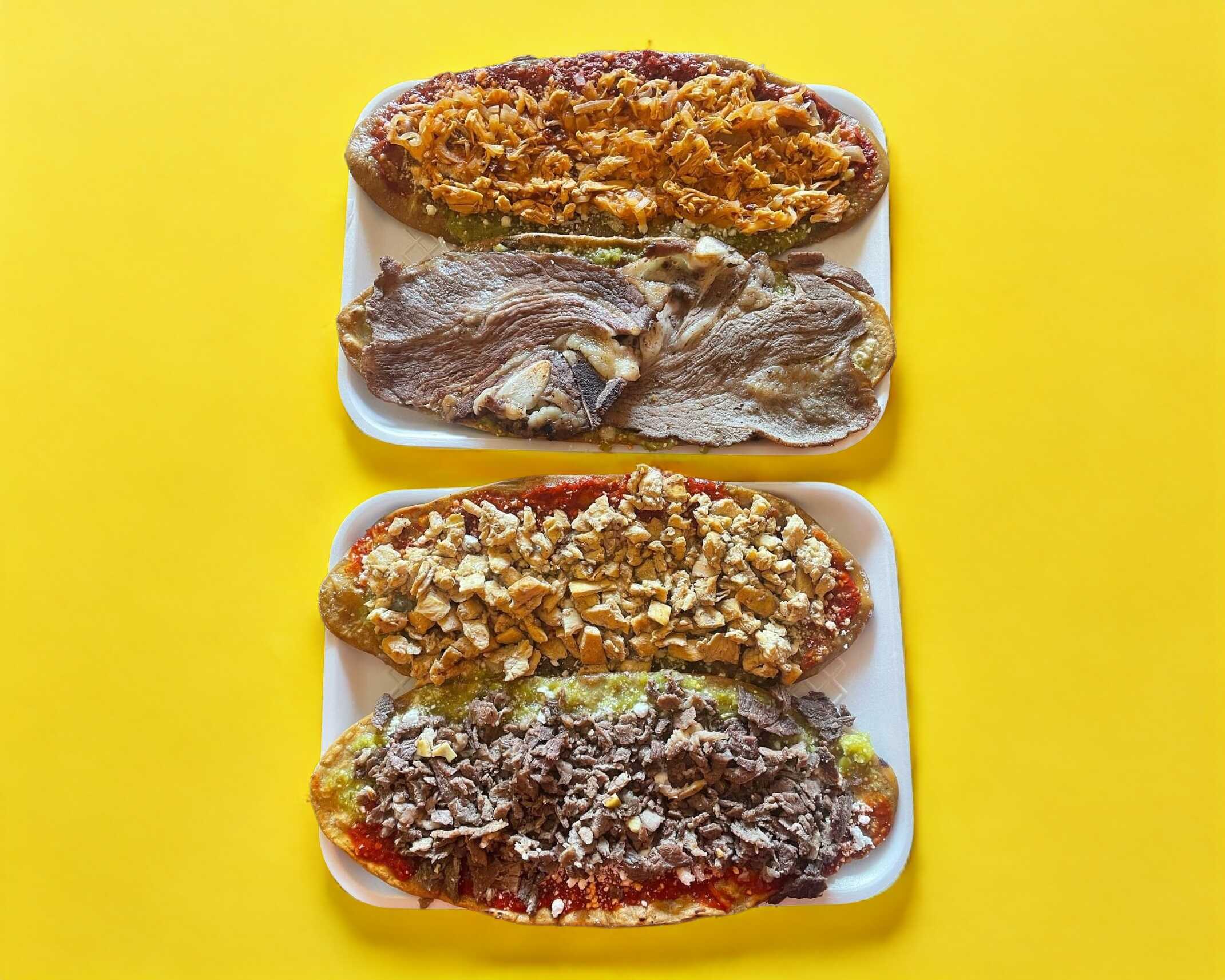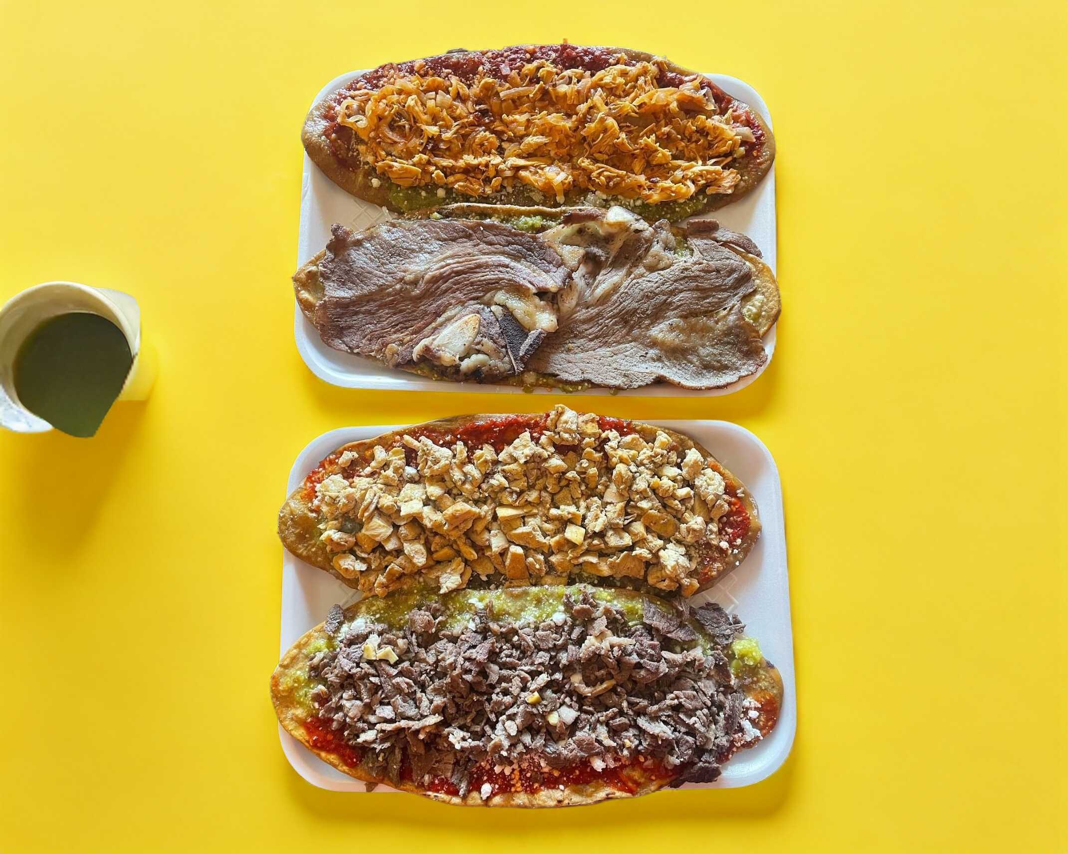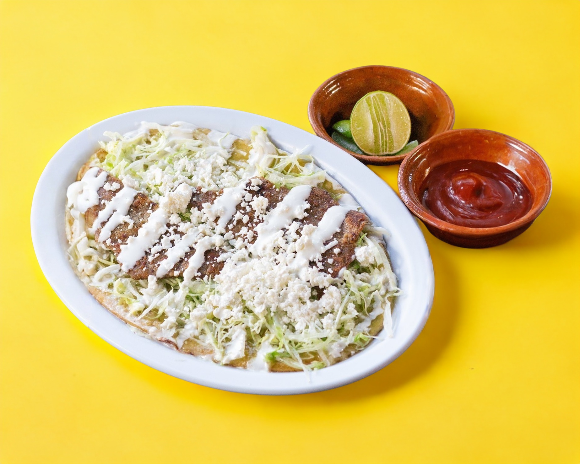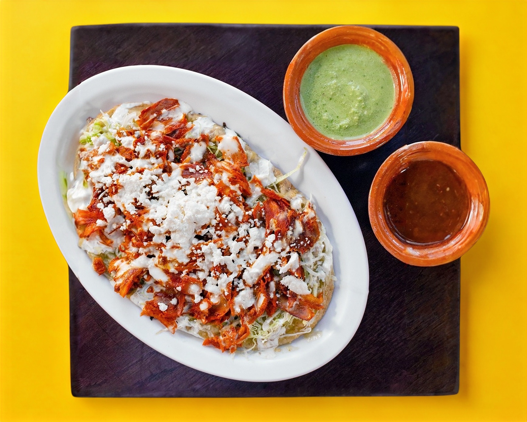 Huarache de masa de maíz, relleno de frijoles, frito en aceite y acompañado del guisado de tu elección, salsa, queso rallado y verduras.