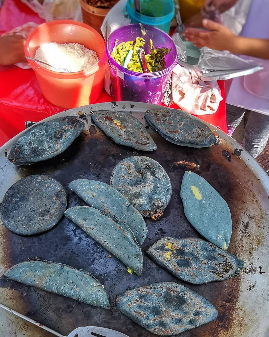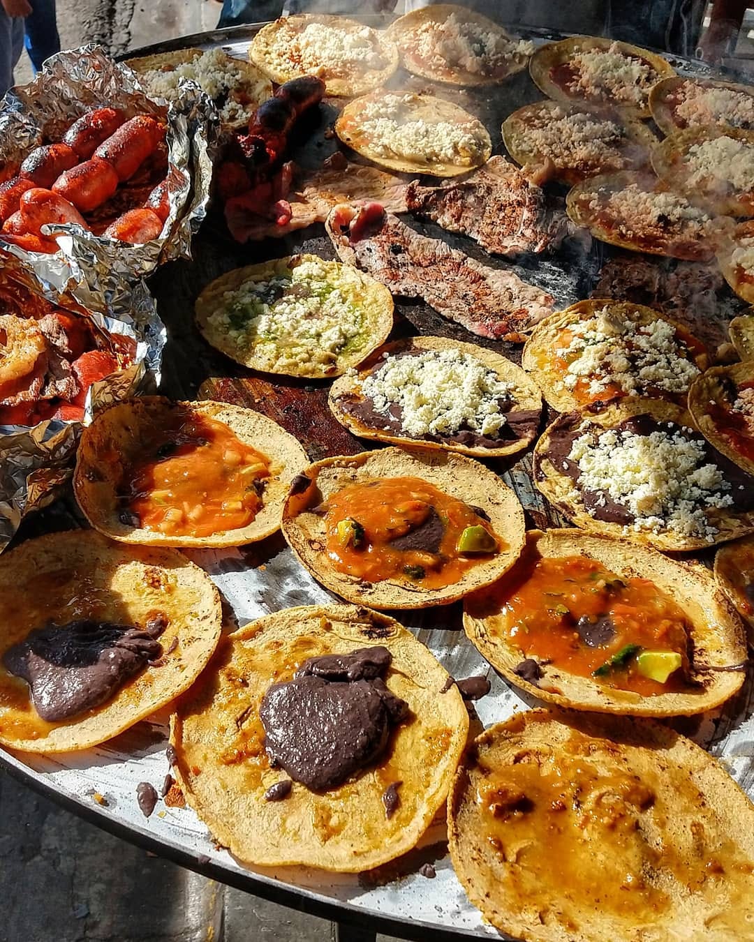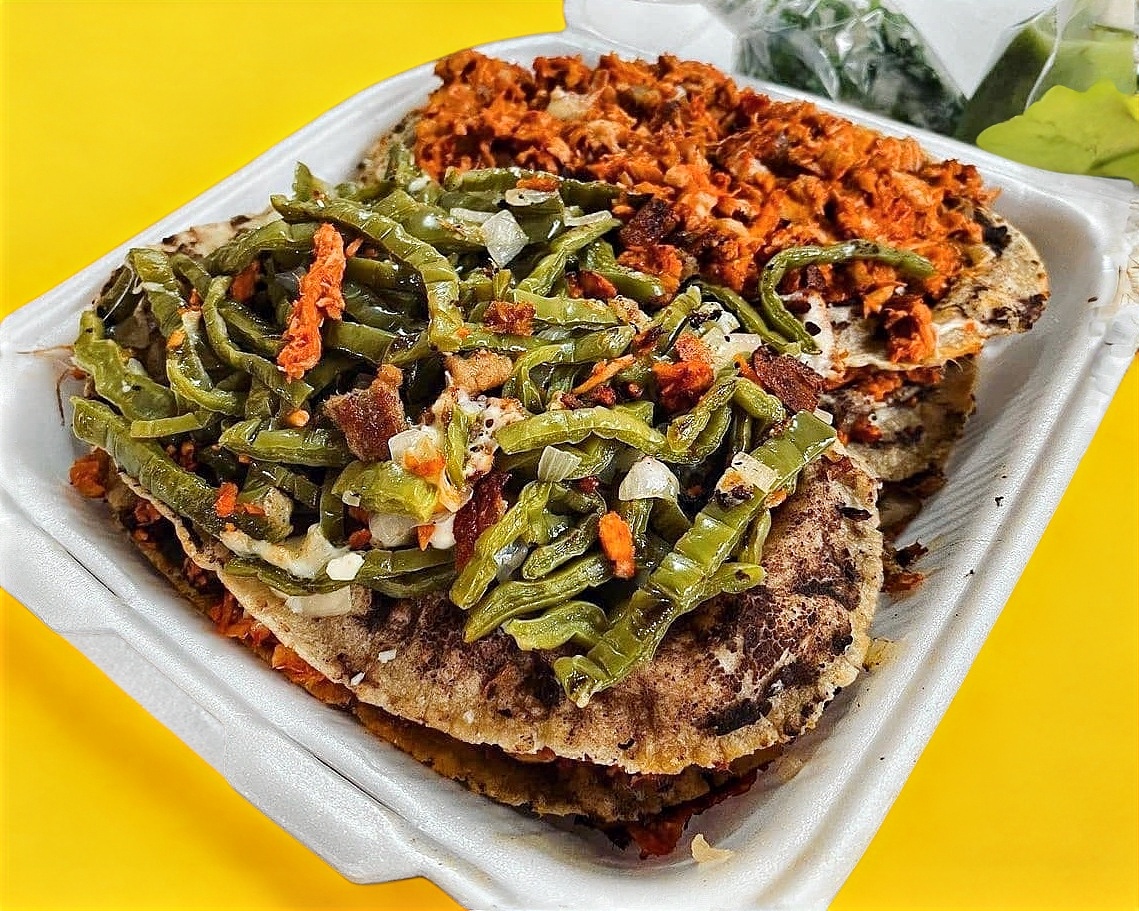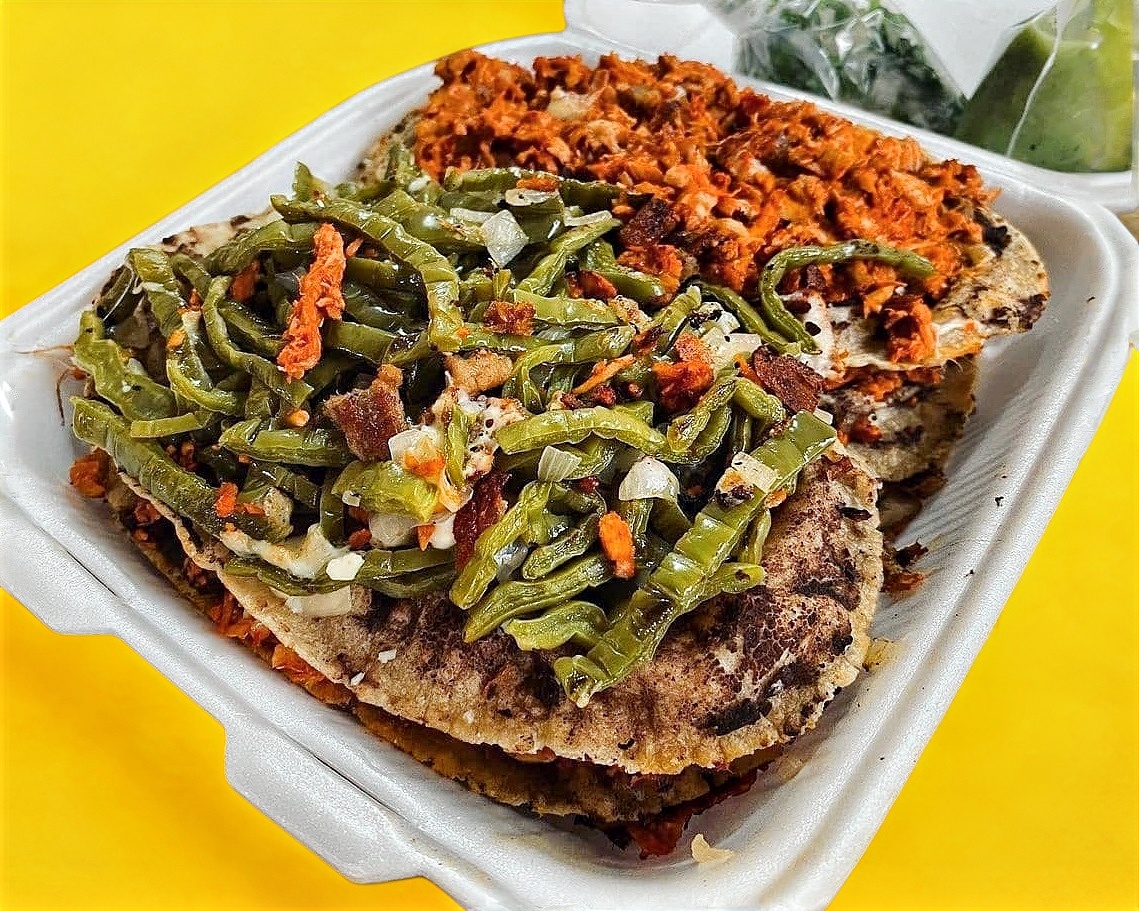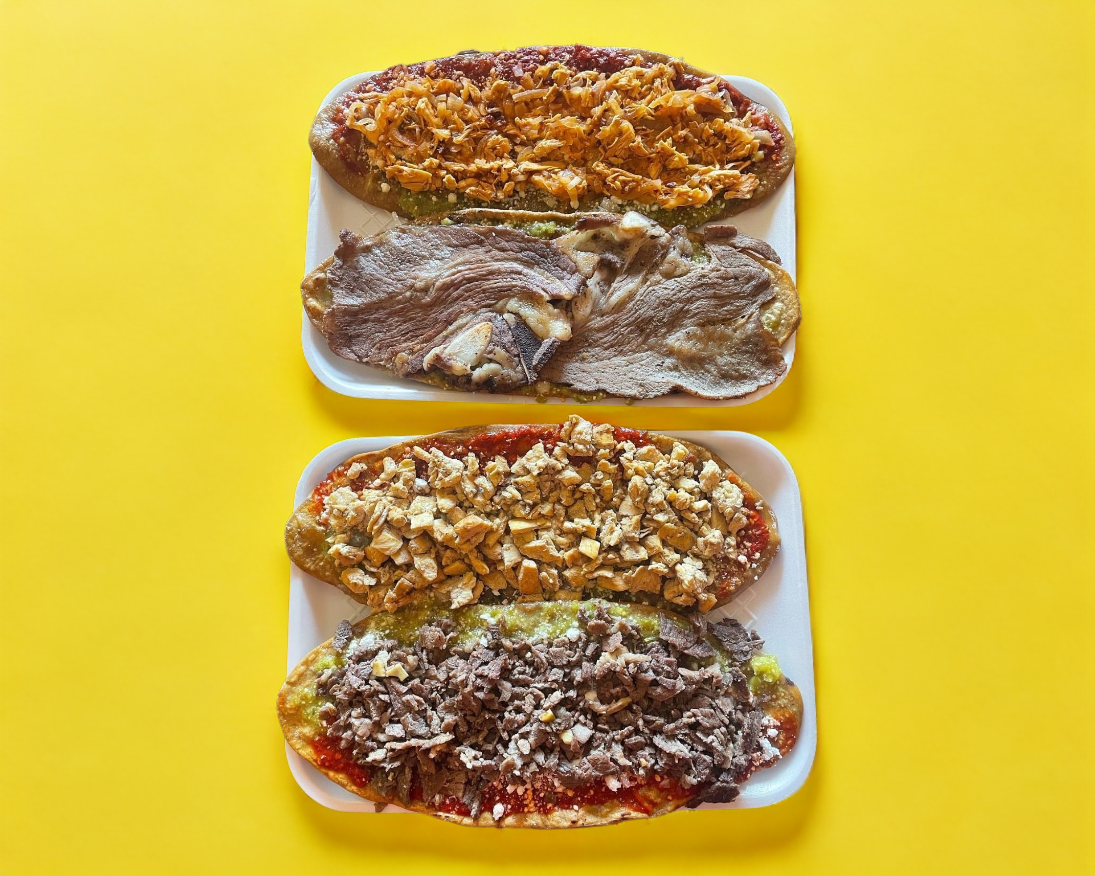 Huarache de masa de maíz, relleno de frijoles, frito en aceite y acompañado del guisado de tu elección, salsa, queso rallado y verduras.