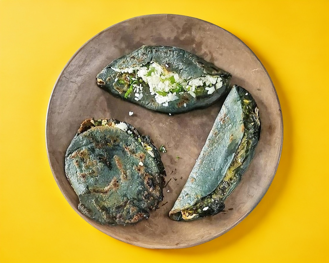 Individual: tortilla de maíz rellena del guisado de tu elección, hecha al comal y acompañada de salsa (aparte) y queso rallado.