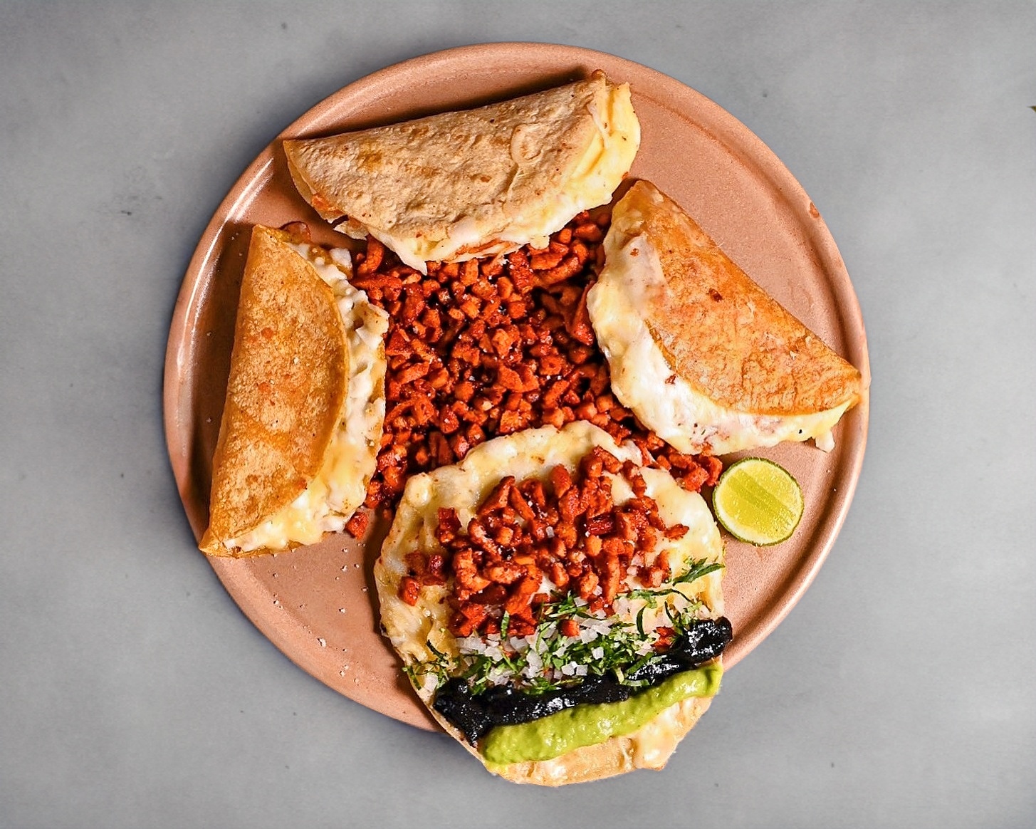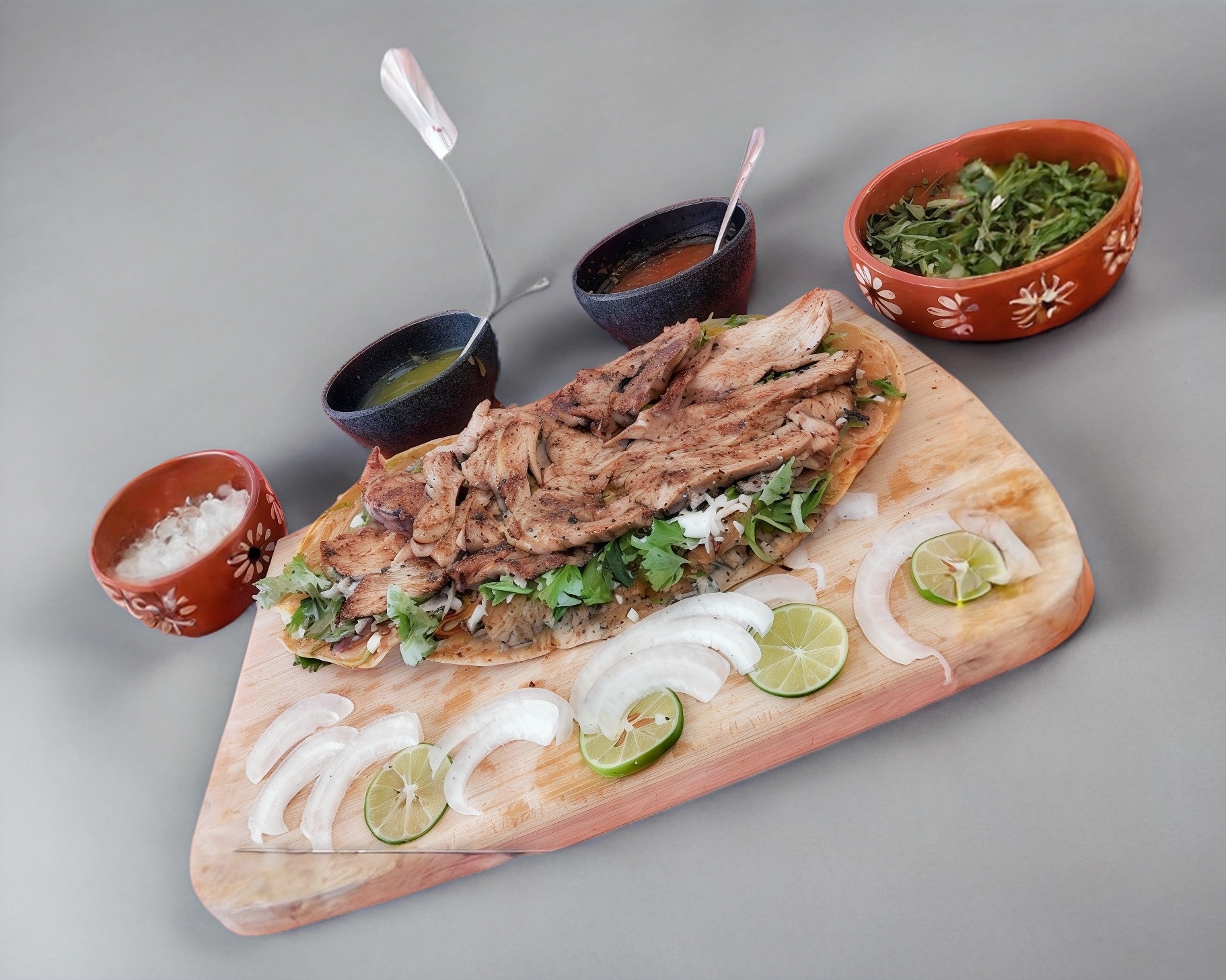 Tortilla de maíz, rellena de bistec , hecha al comal, acompañada de queso rallado, cebolla y salsa.
