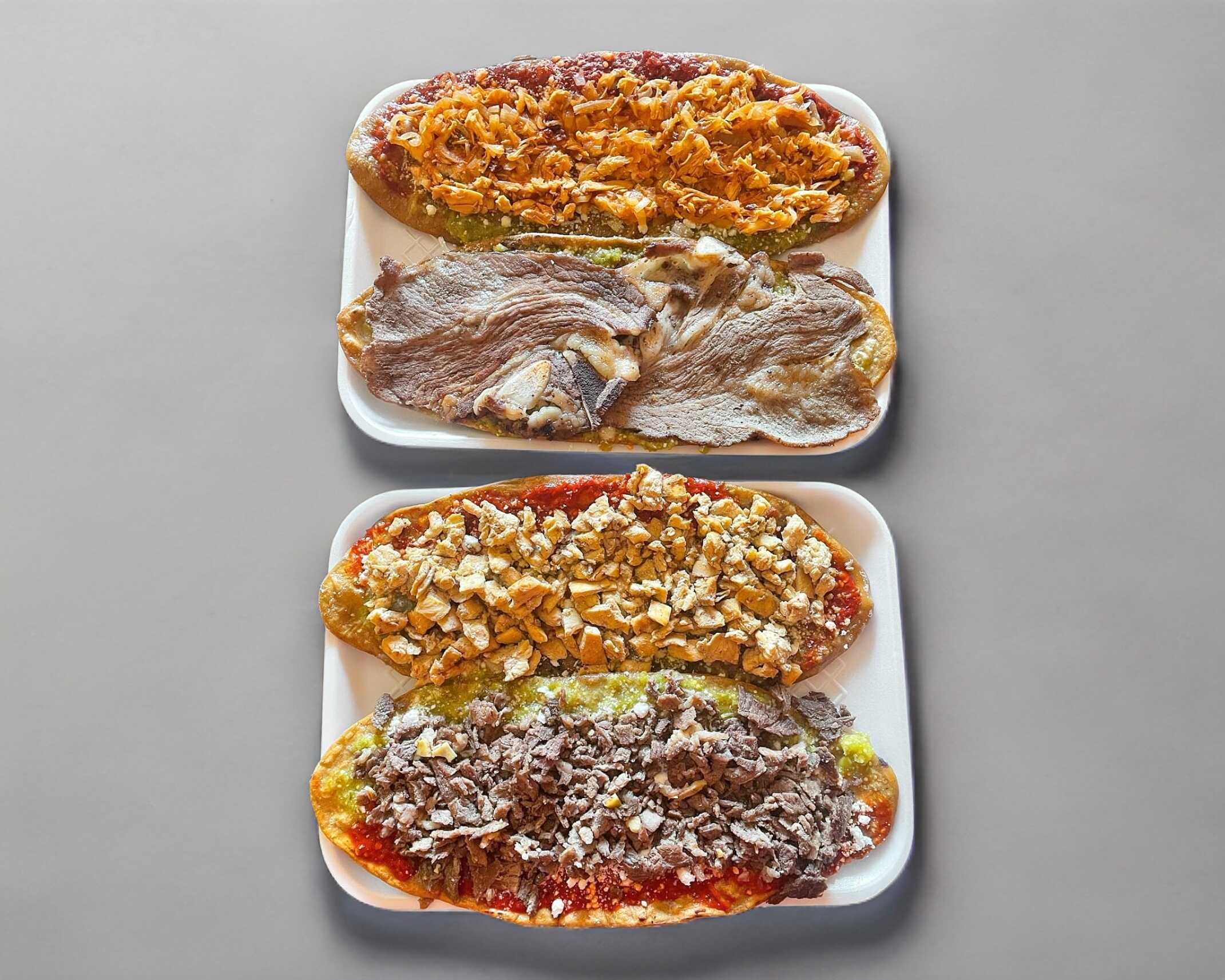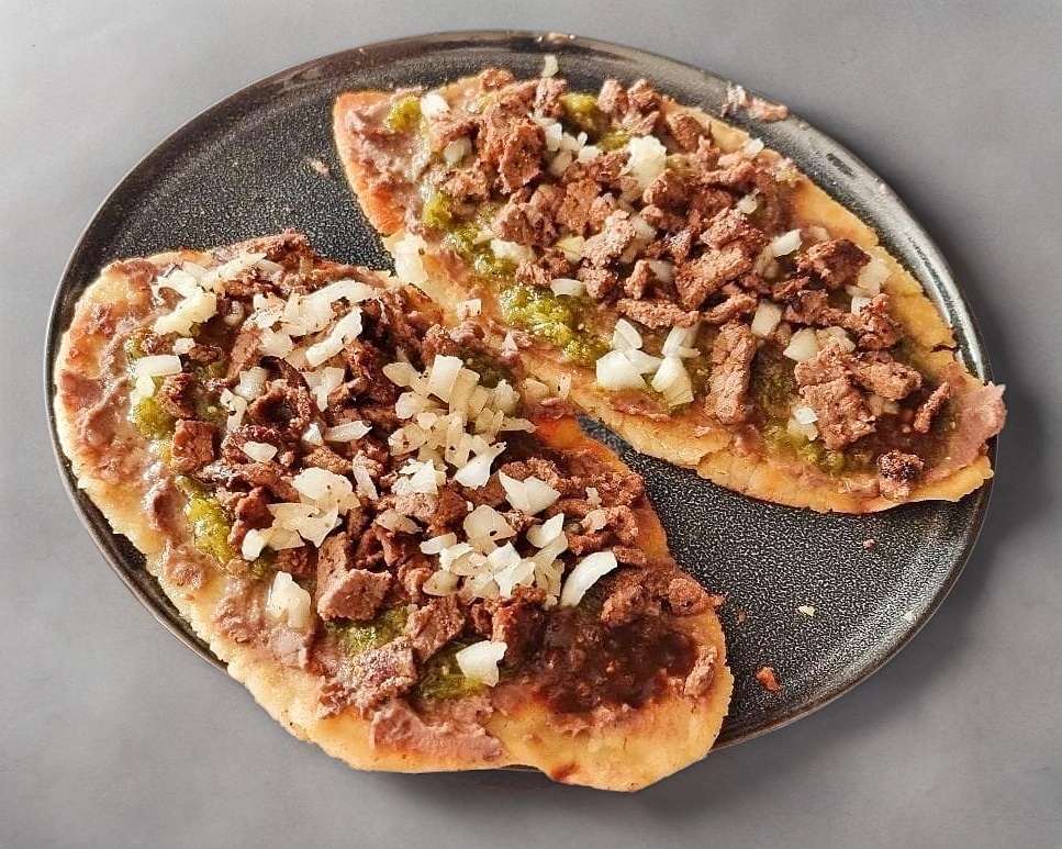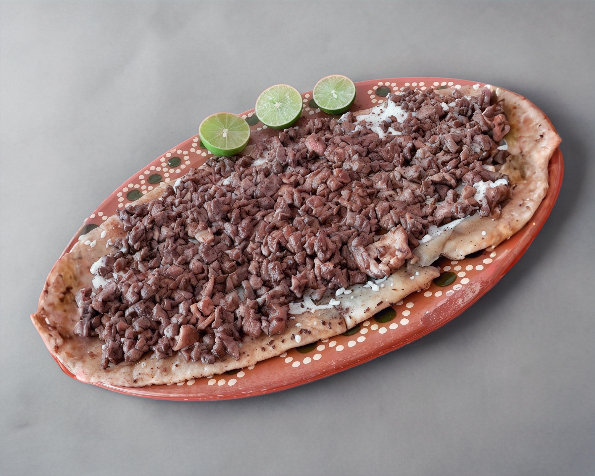Huarache de masa de maíz, relleno de frijoles, frito en aceite y acompañado de bistec , salsa, queso rallado y cebolla..
