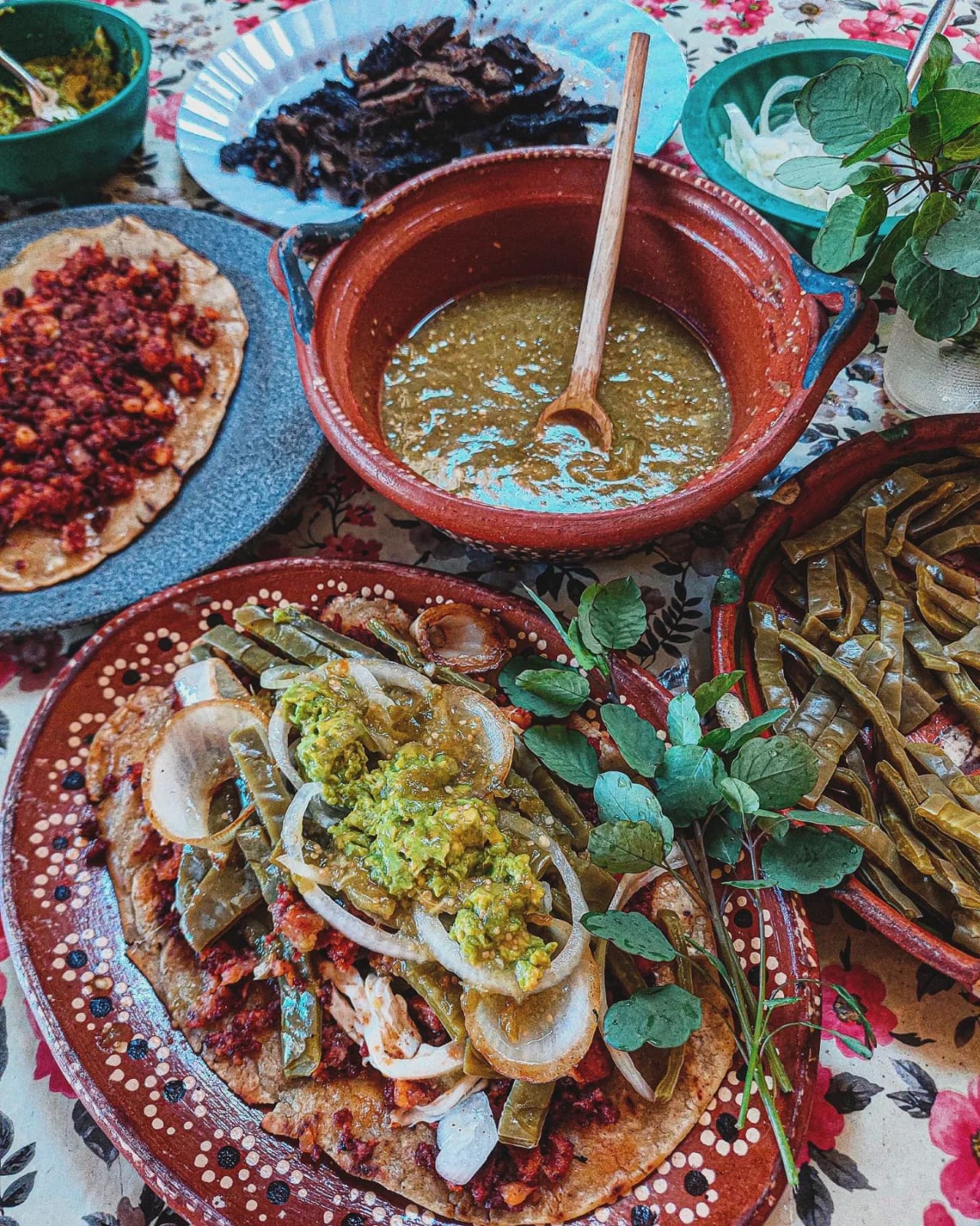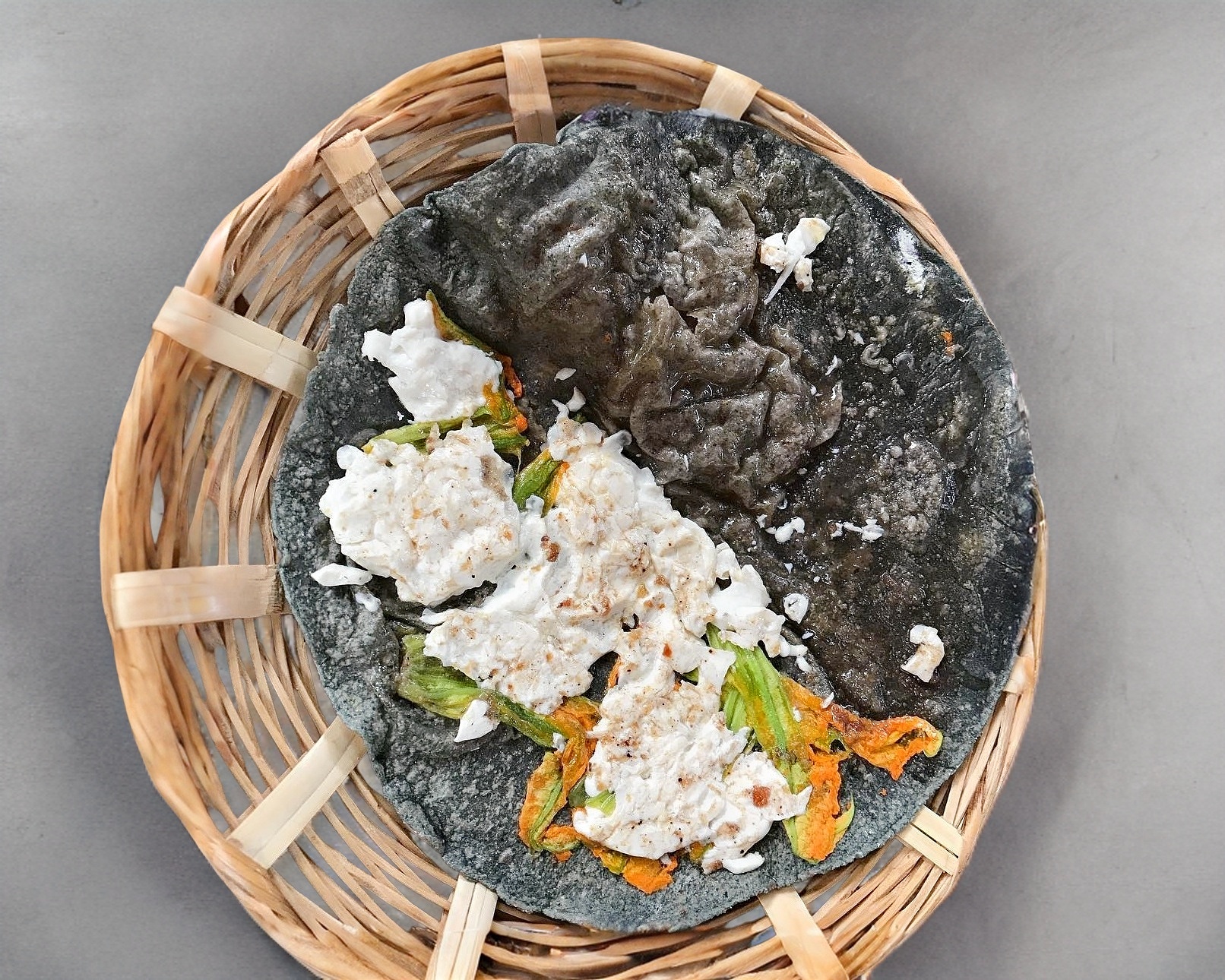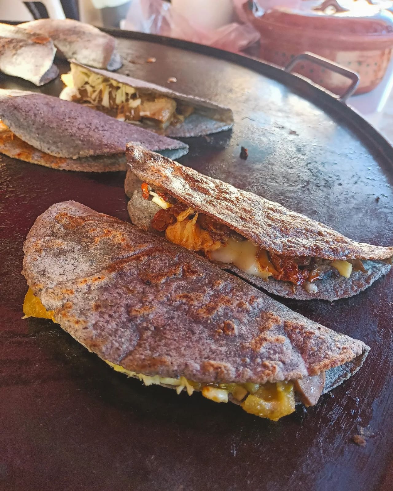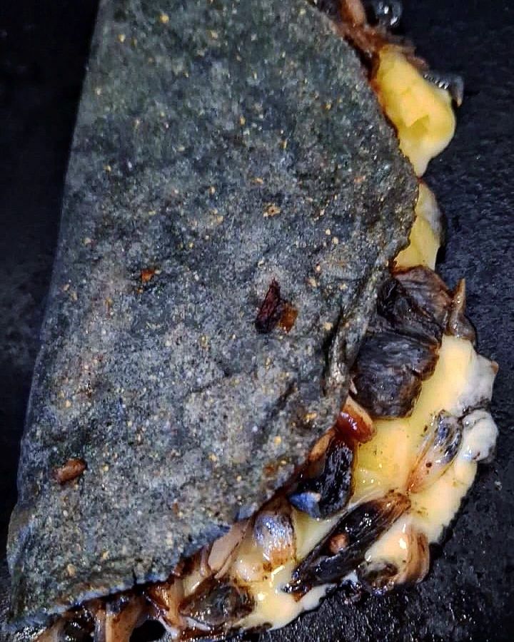 Tortilla de maíz, rellena de champiñones, hecha al comal, acompañada de salsa, queso rallado y cebolla