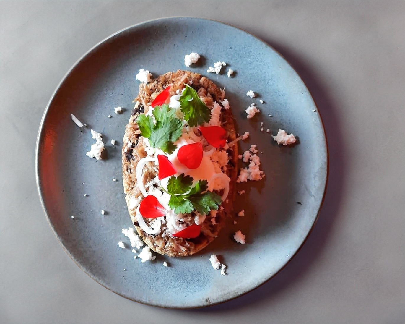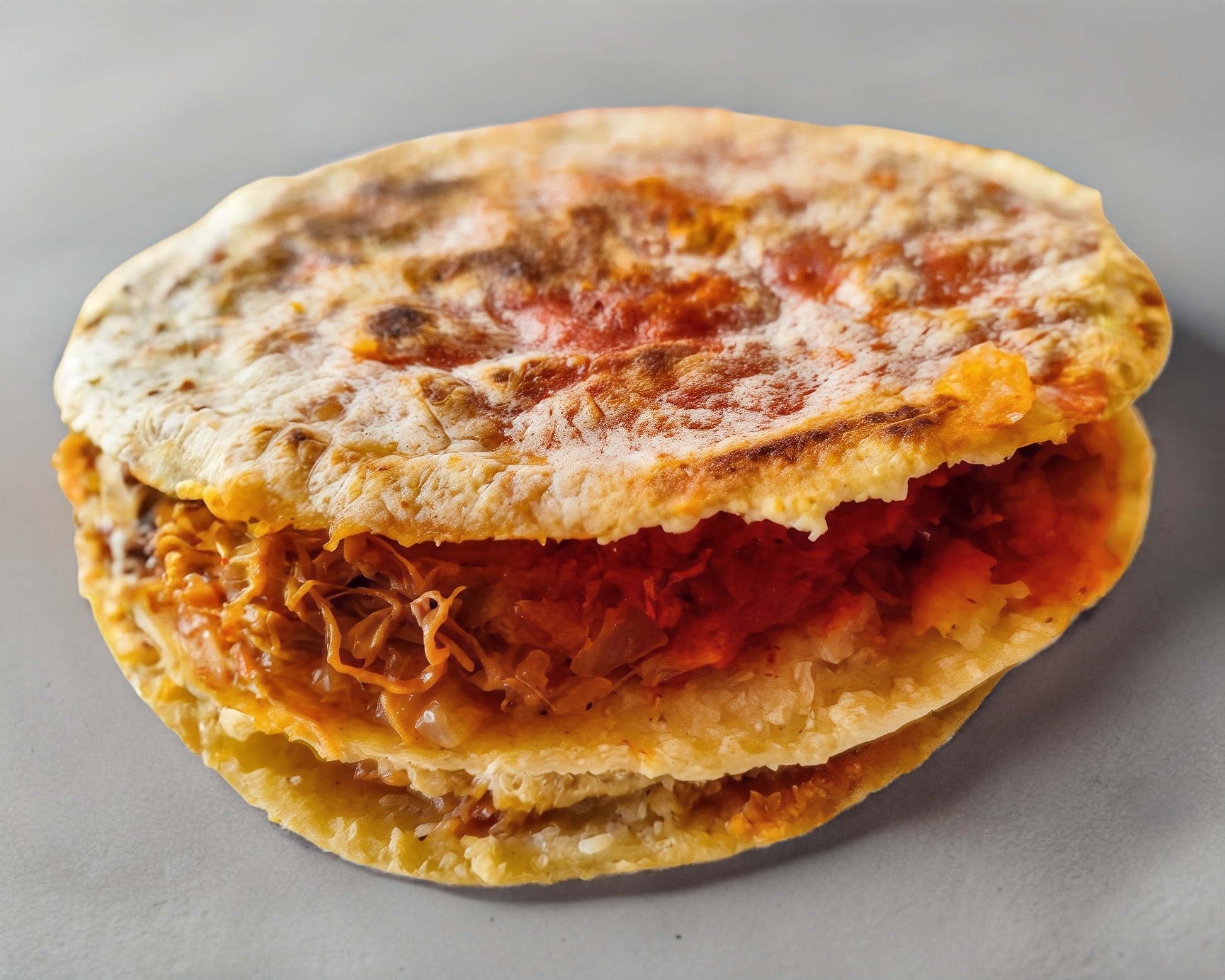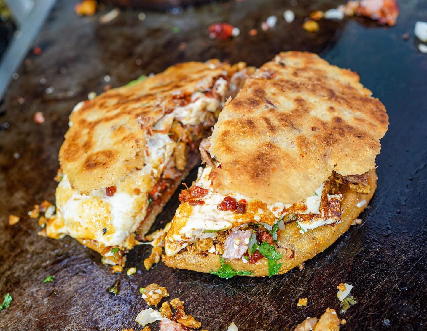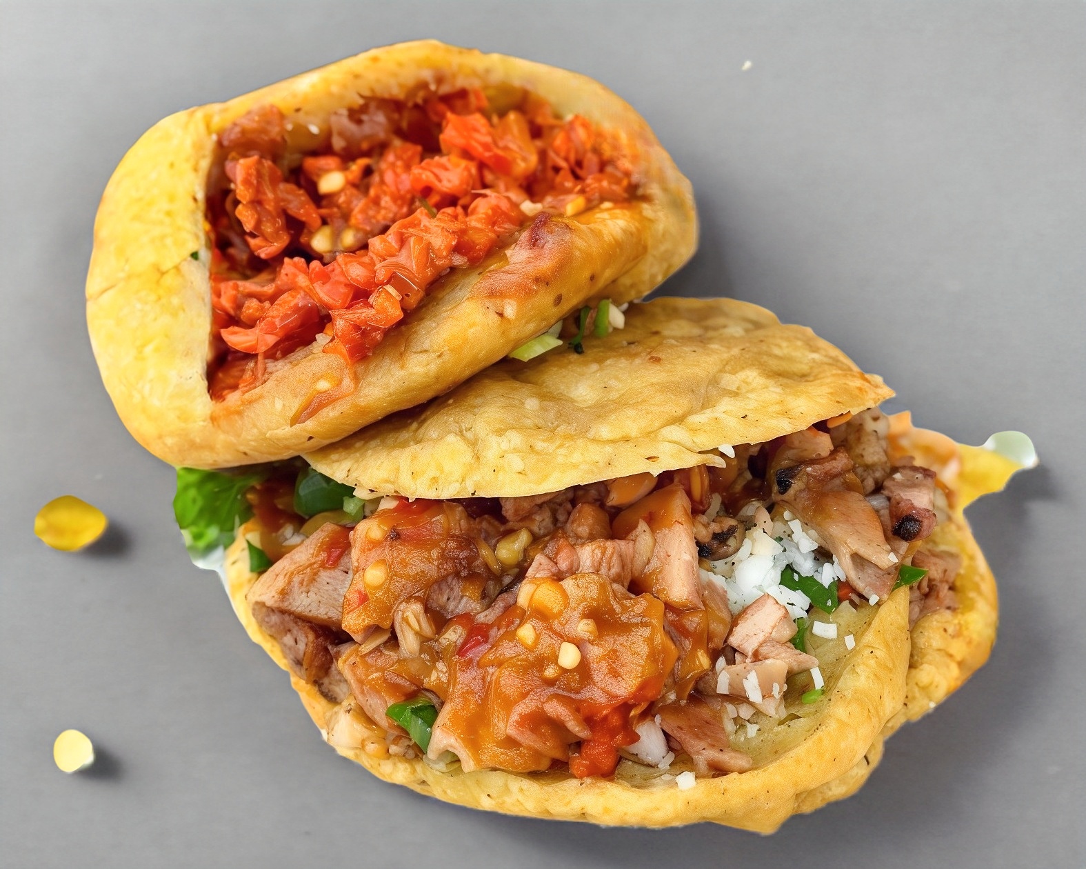 Gordita de masa de maíz, rellena de chicharrón prensado, frita en aceite y acompañada de salsa, queso rallado y cebolla