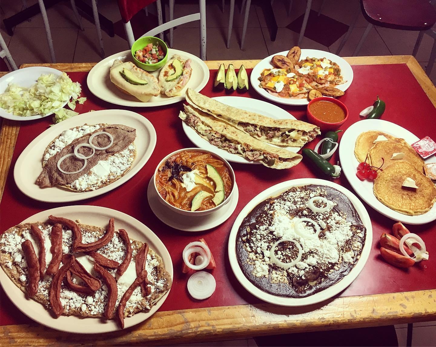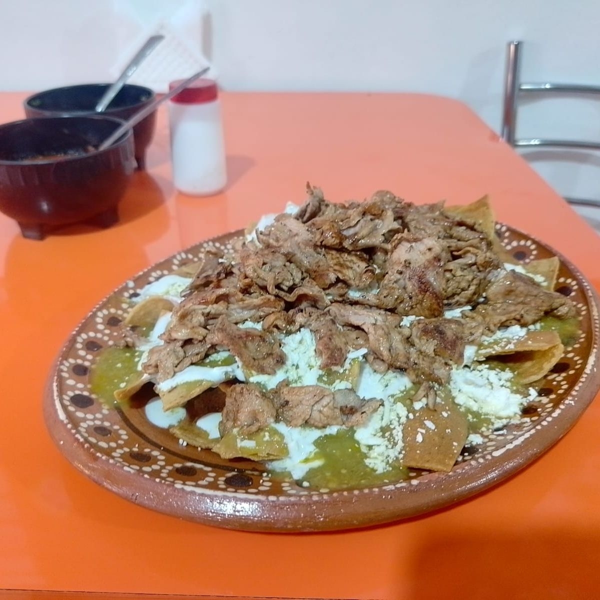 Telera bañada en chile guajillo, frita en comal, relleno de papas con longaniza,. acompañado de queso, crema y lechuga