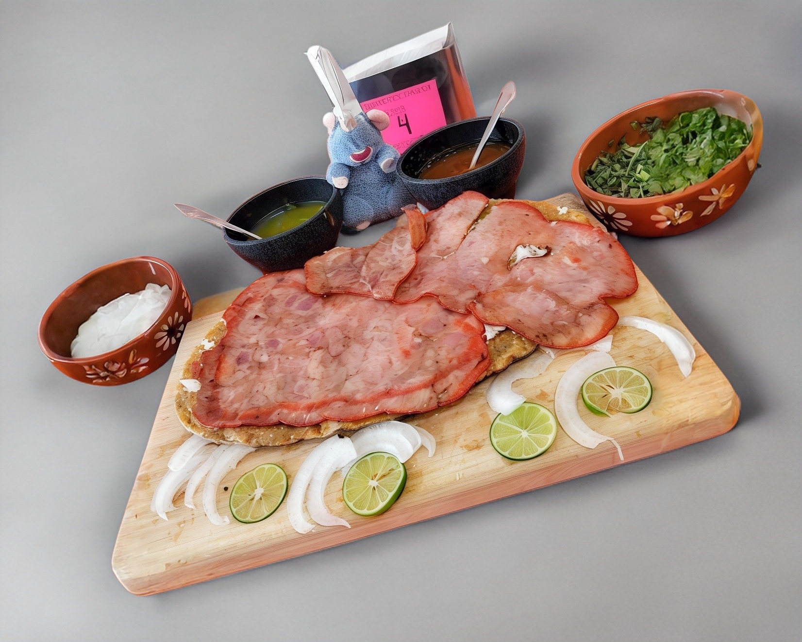 Huarache de masa de maíz, relleno de frijoles, frito en aceite y acompañado de chuleta ahumada , salsa, queso rallado y cebolla.