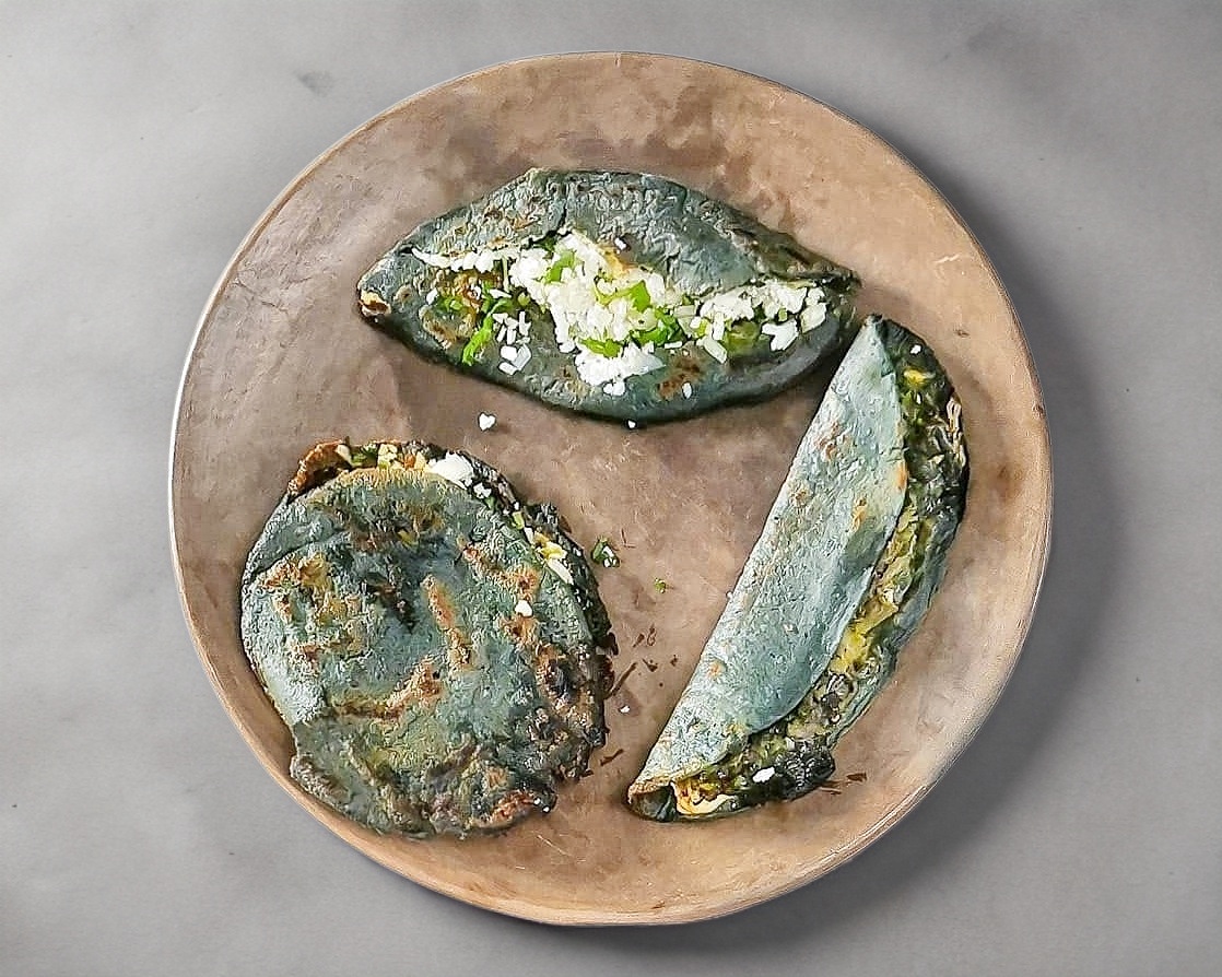 Tortilla de maíz, rellena de quesillo, hecha al comal, acompañada de salsa, cebolla y queso rallado.