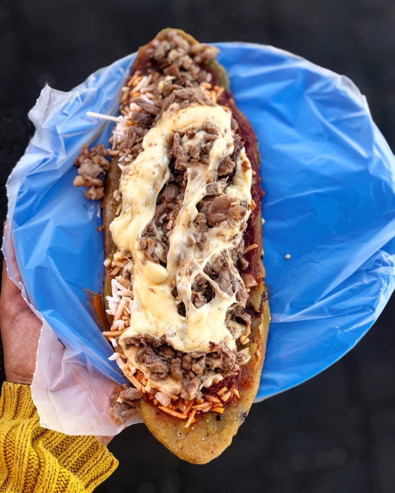 Gordita de masa de maíz, rellena de suadero, frita en aceite y acompañada de salsa, queso rallado y cebolla.