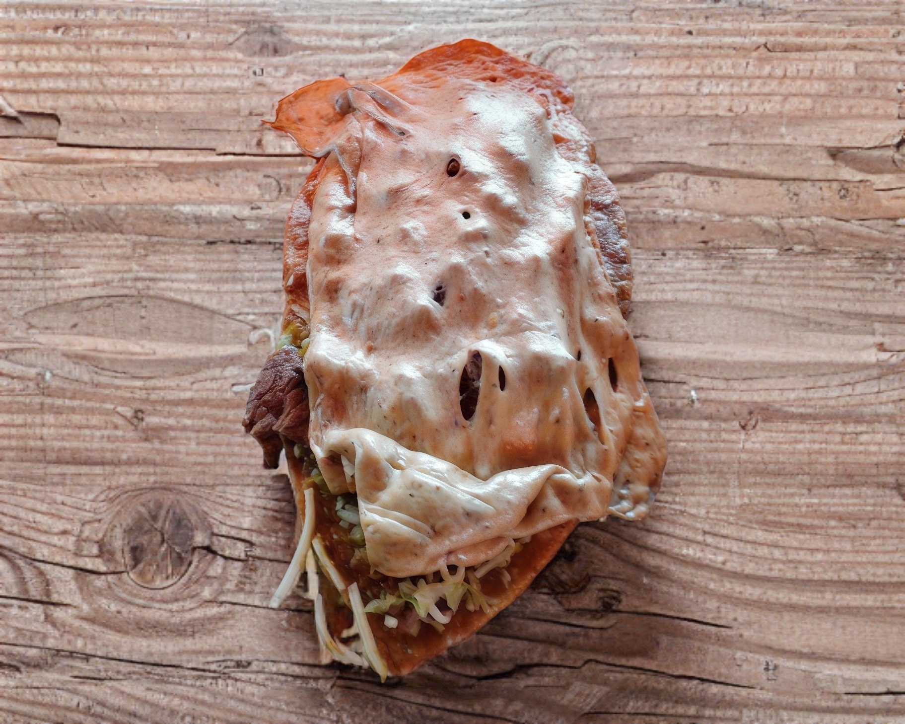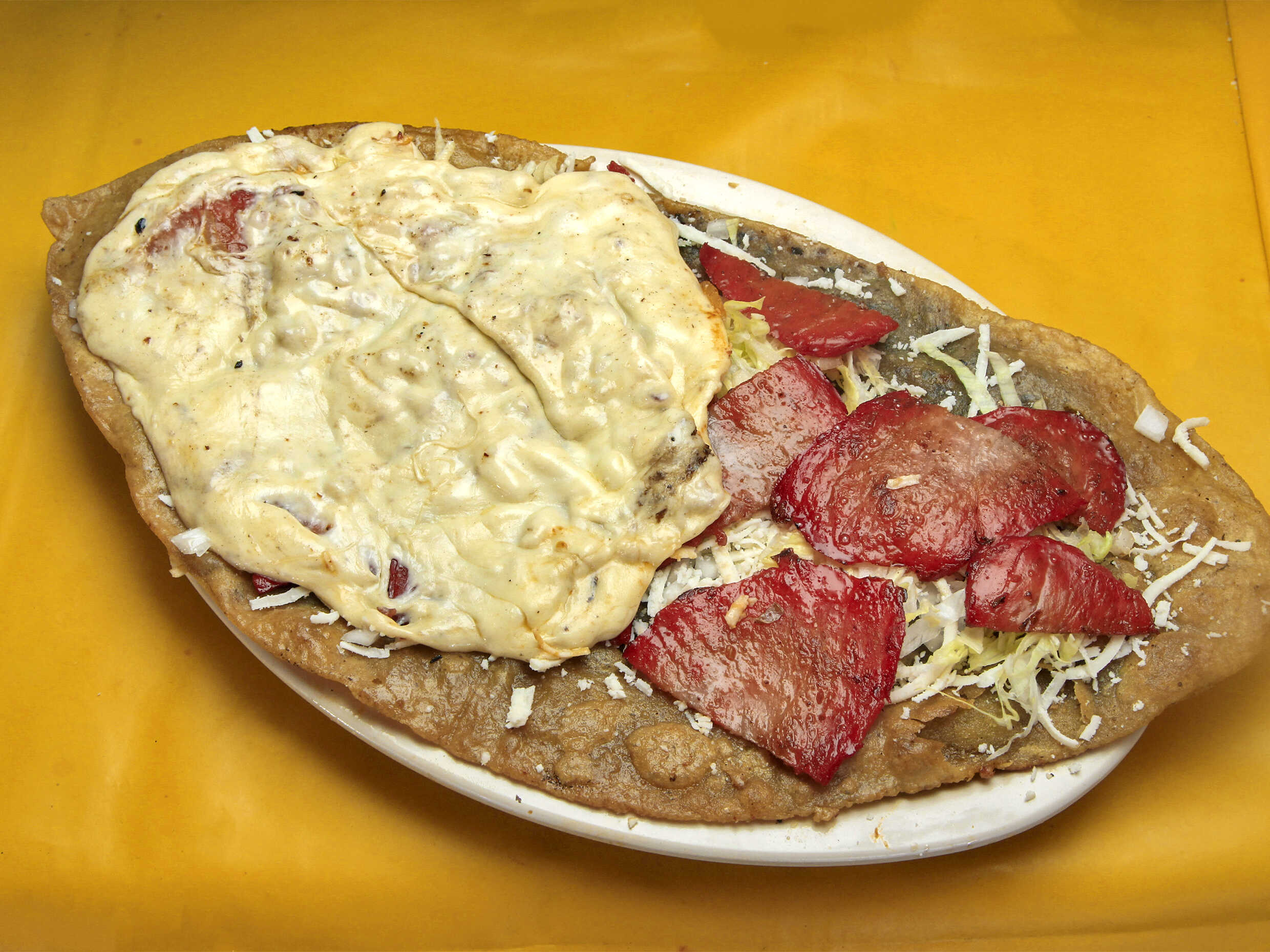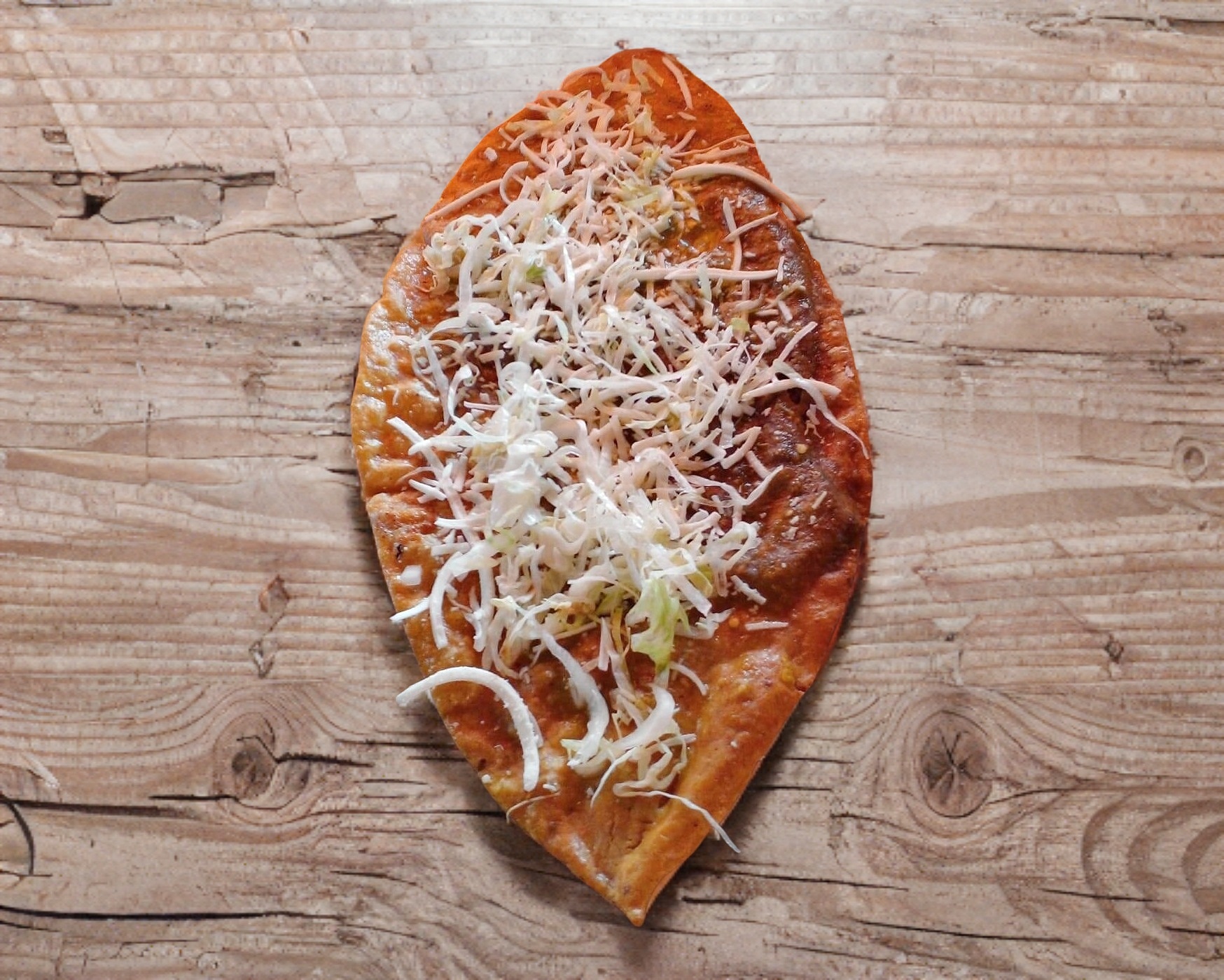 Tortilla 21cm, chicharrón prensado, cebolla, queso rayado y lechuga picada, salsa aparte