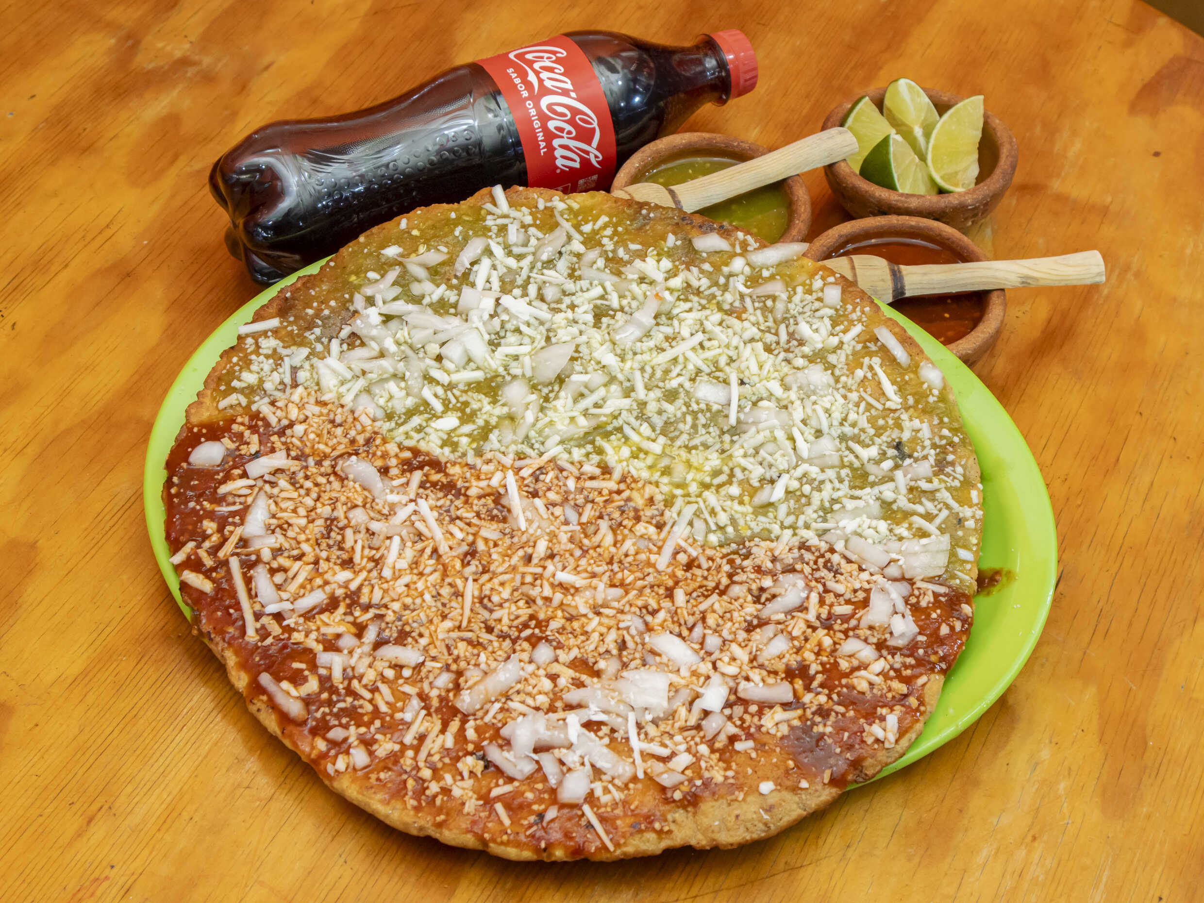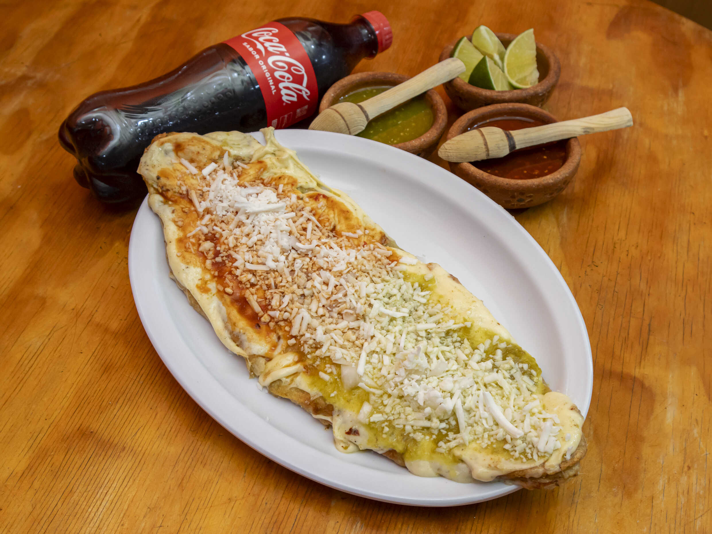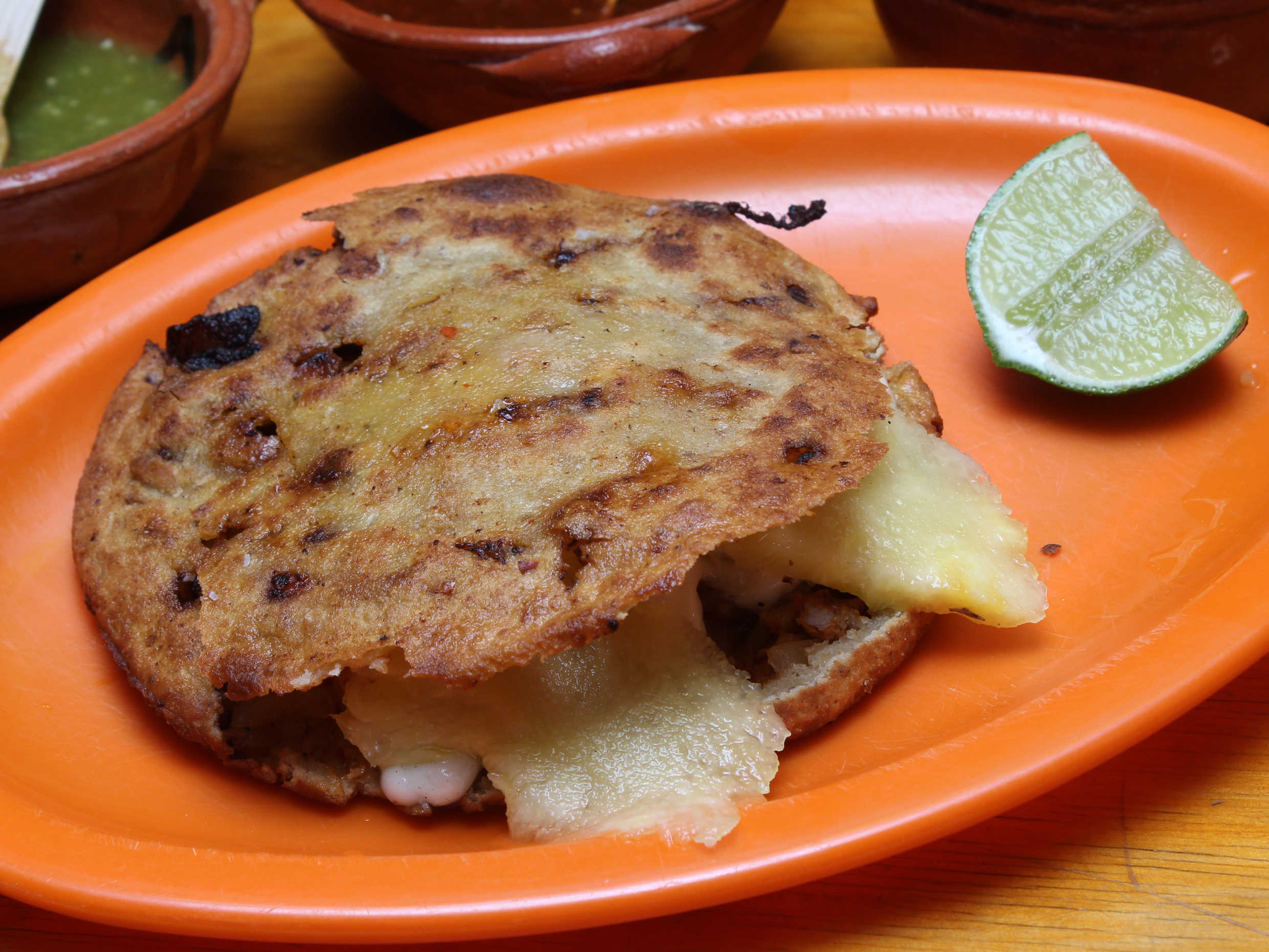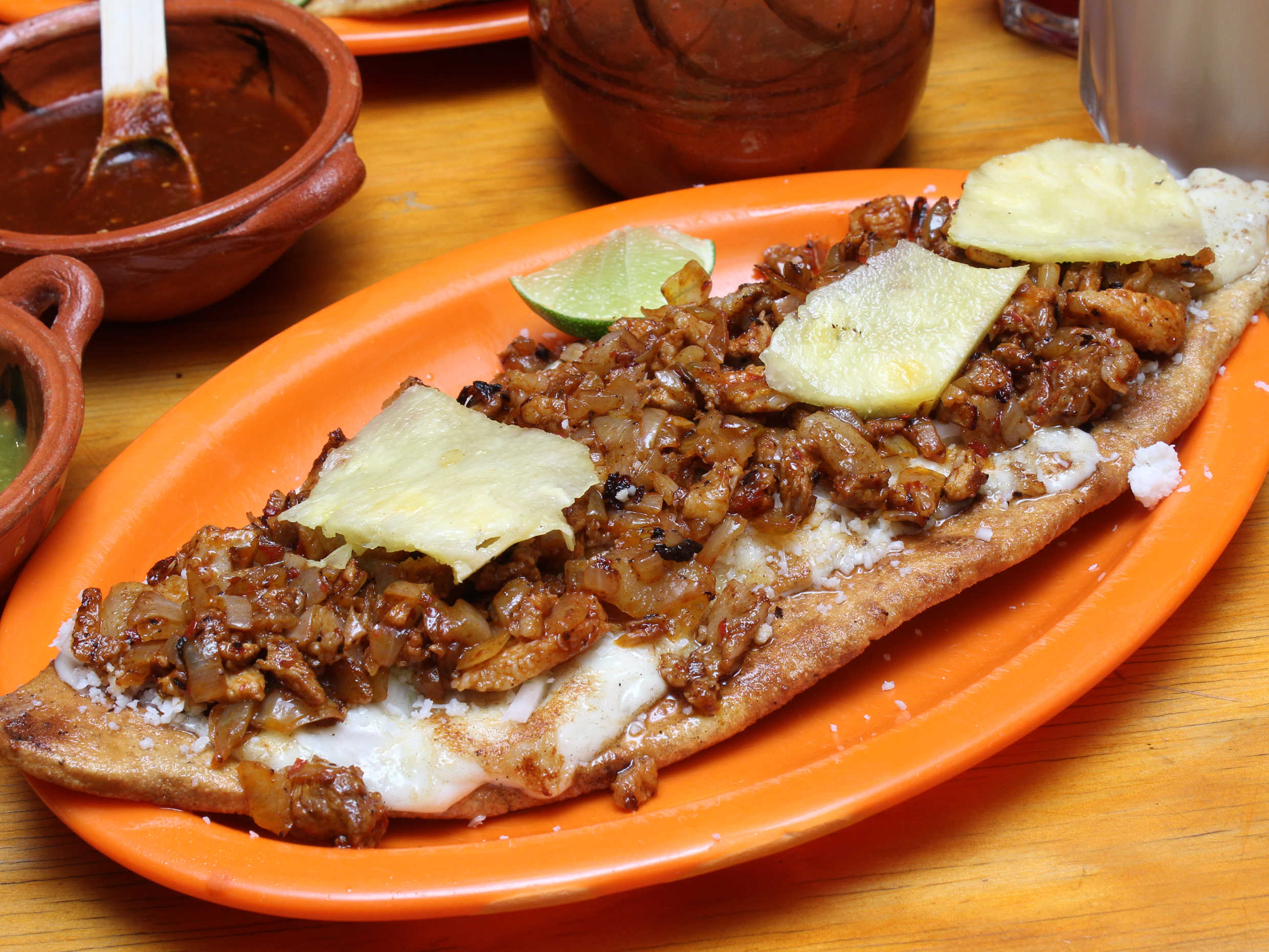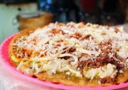 Rellena de frijol con salsa verde o roja a elegir, cebolla, queso rallado y carne.