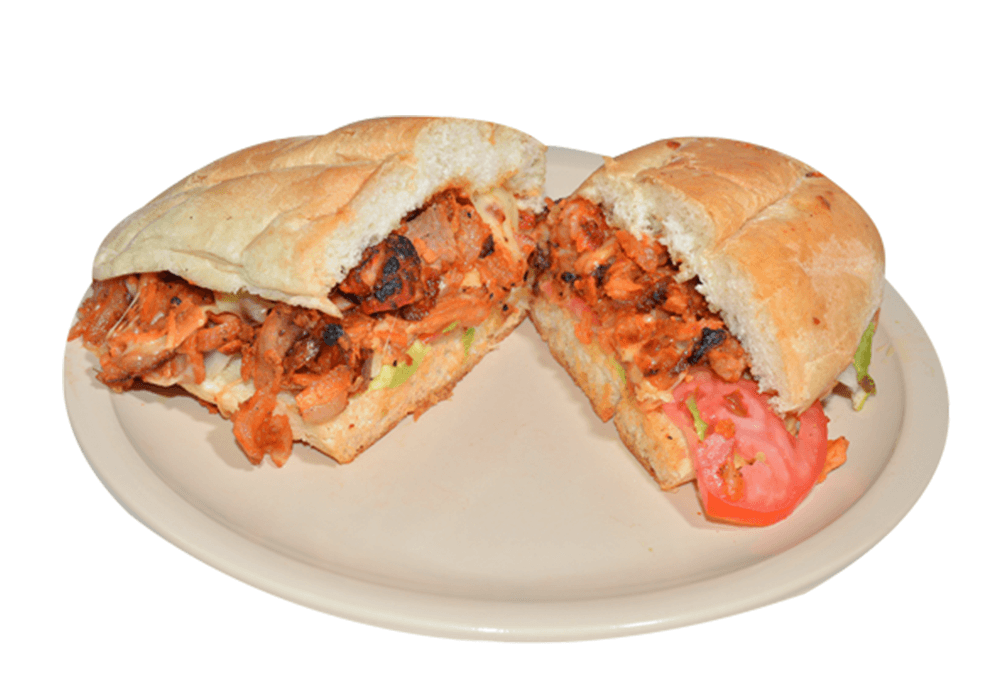 Pastor, aguacate, tomate, cebolla y aderezos.