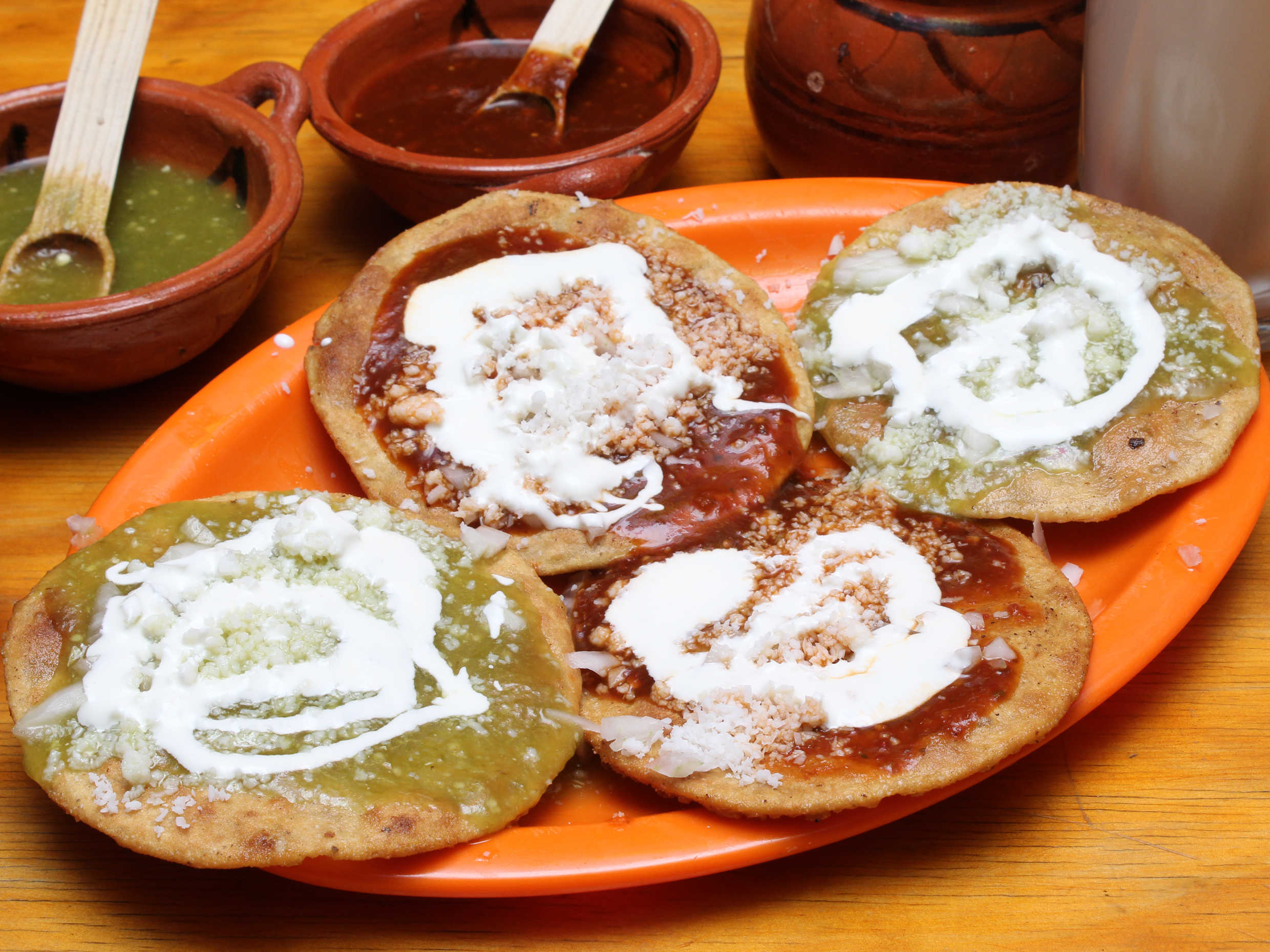 Rellena de frijol con salsa verde o roja a elegir, cebolla y queso rallado.