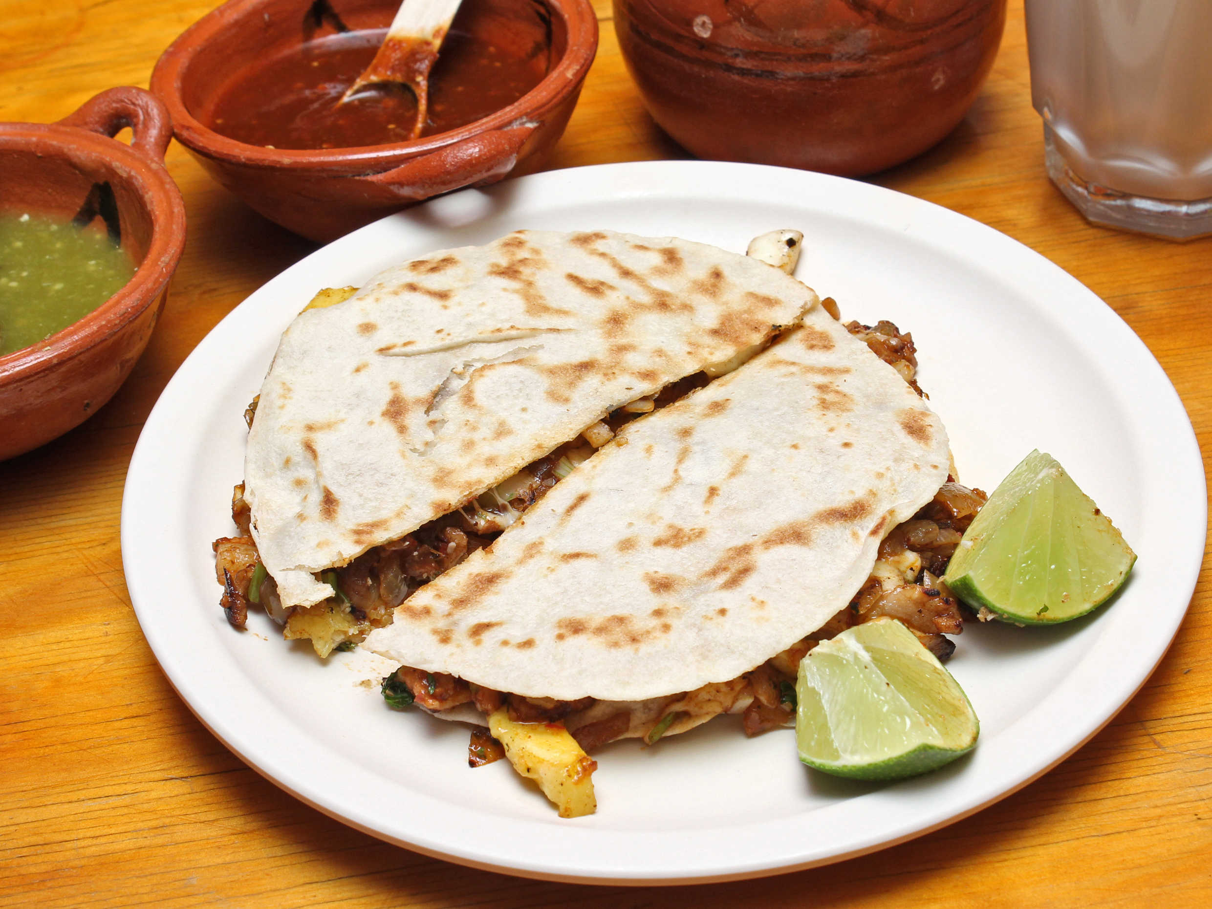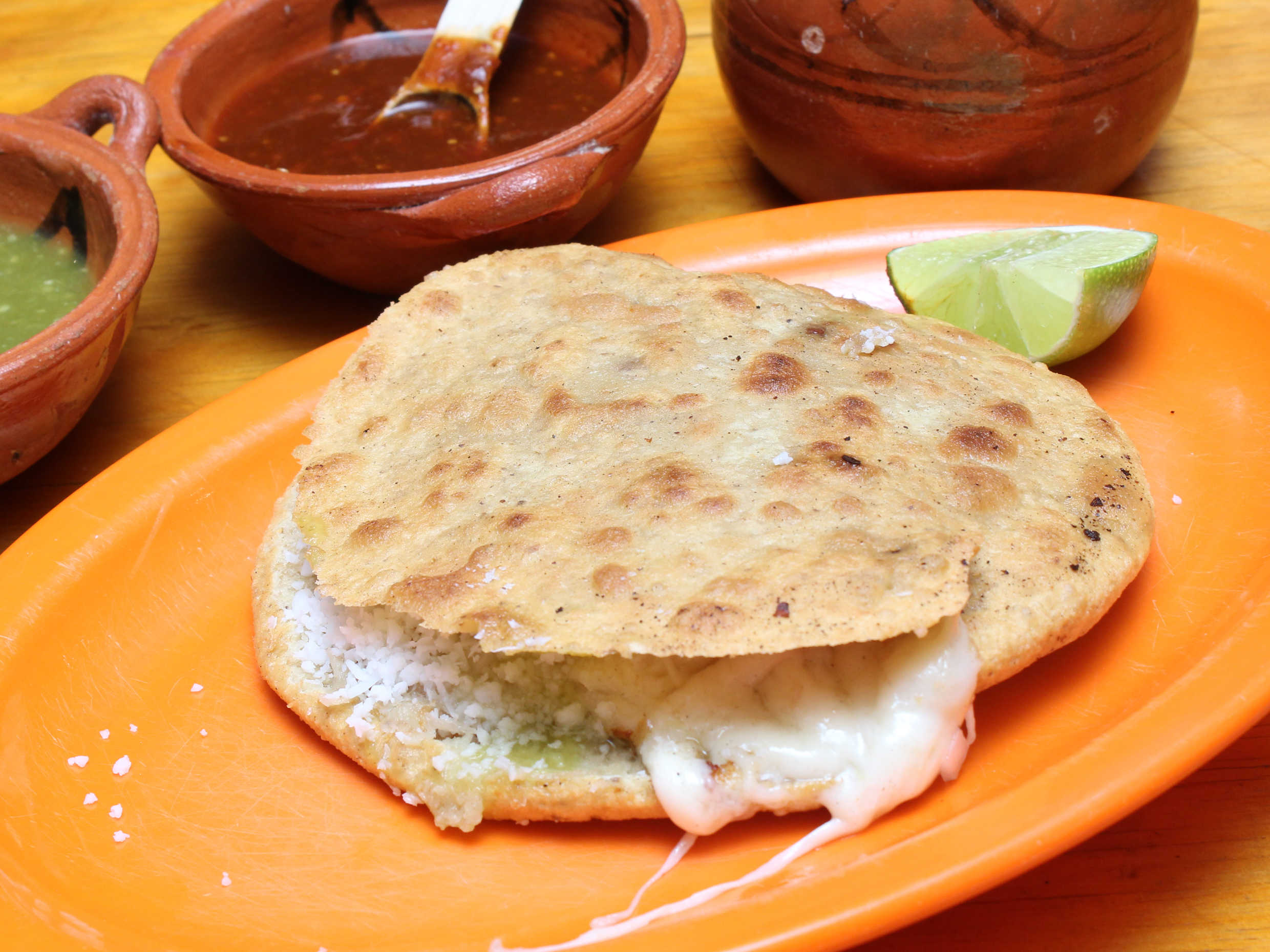 Relleno de frijol, salsa verde o roja, cebolla y queso rallado.