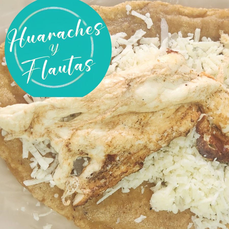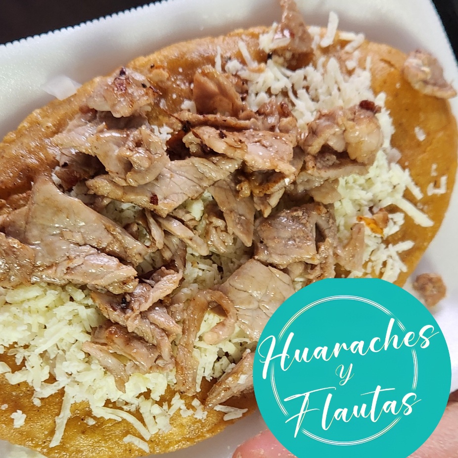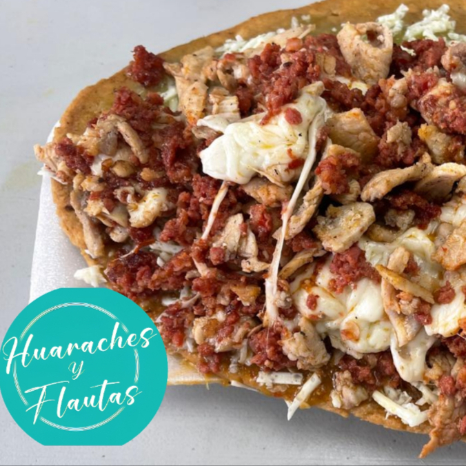 Delicioso huarache de bisteck y longaniza incluye salsa verde y/o roja con cebolla y exquisito queso mantequilla