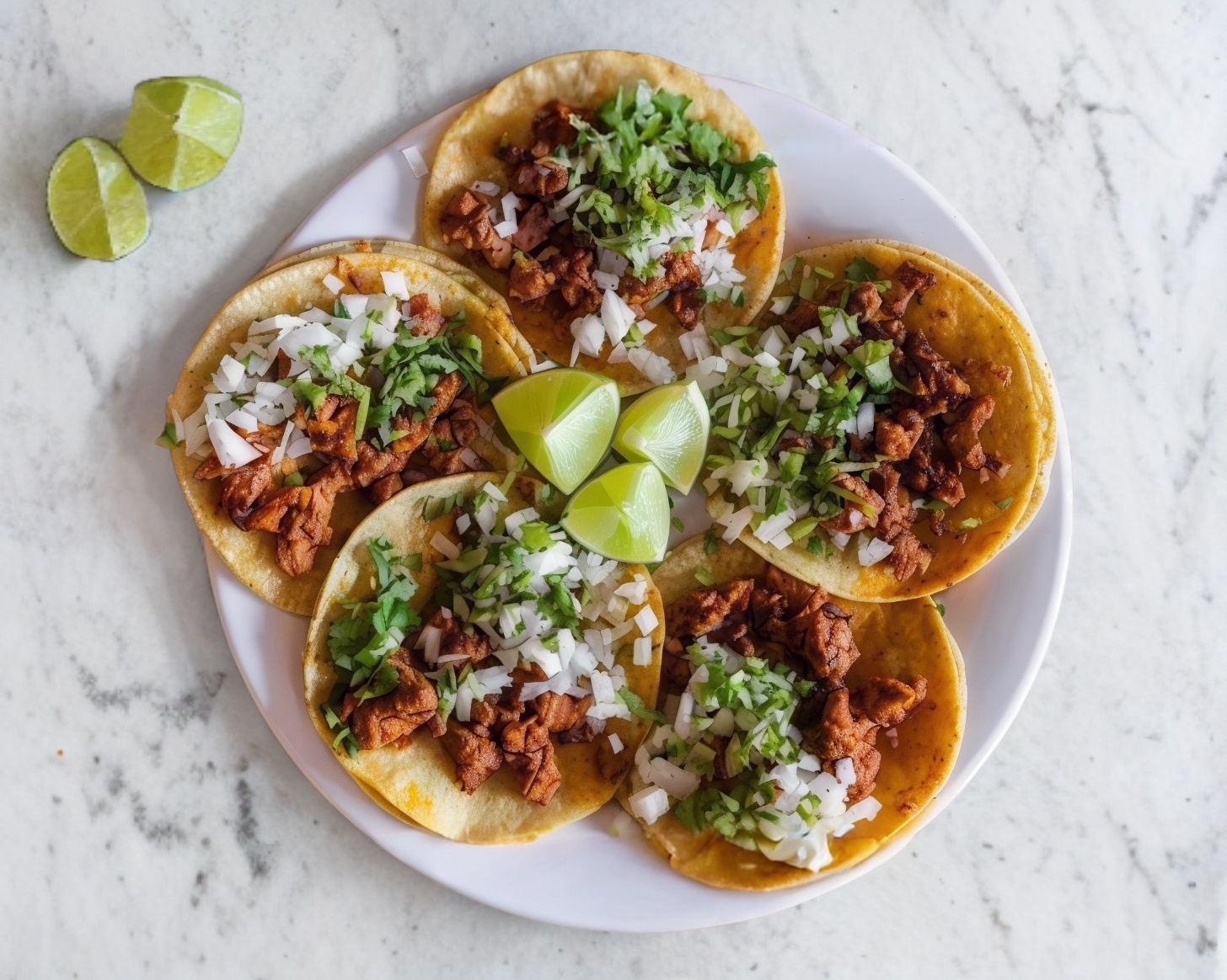 Porción para una persona de 5 tacos al pastor con doble tortilla de maíz pequeña, cebolla, cilantro y piña (salsa roja (morita), verde (habanero), naranja (chile de árbol).