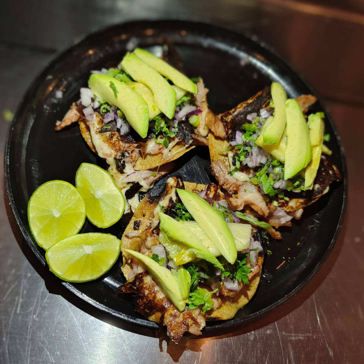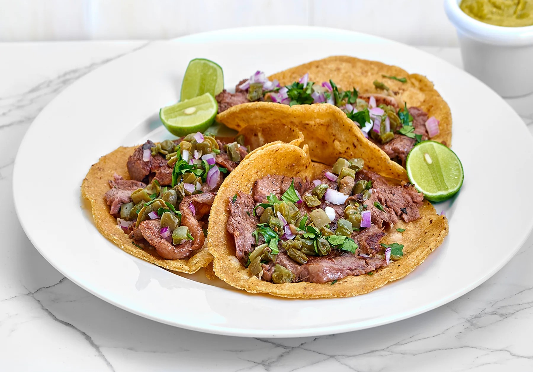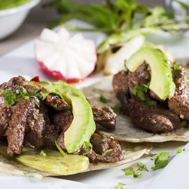 2 tacos de arrachera con aguacate cebolla y cilantro