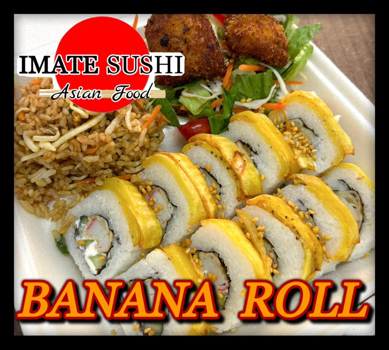 Plátano macho frito de cobertura, acompañado de yakimeshi, 2 kushiages ensalada lechuga, zanahoria rayada col rayado, tomate cherry en cuadros.