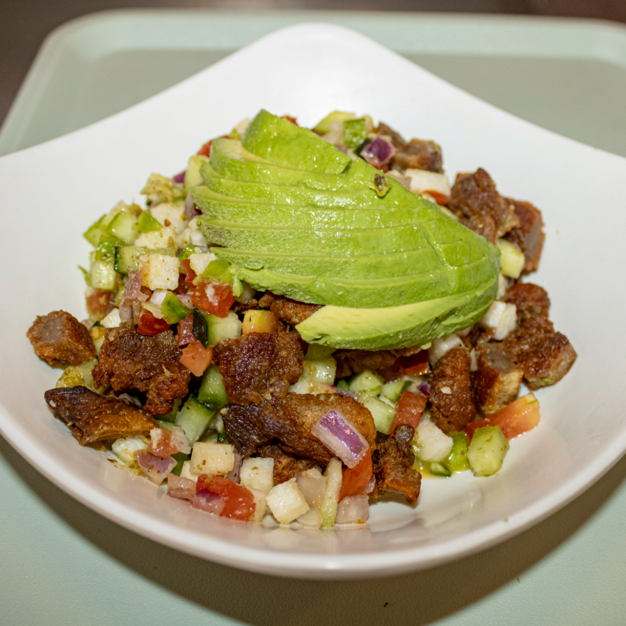 Ceviche con chicharrón norteño, pepino, jitomate, cebolla, camarón, base de la casa, aderezo, salsa casera y tamaño a elegir, incluye 3 tostadas de maíz.
