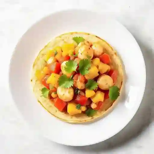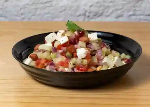 Mango con pepino, piña, verduras de cebolla, jícama, queso cotija, chile negro tipo gazpacho michoacano y tamaño a elegir, incluye 3 tostadas de maíz.
