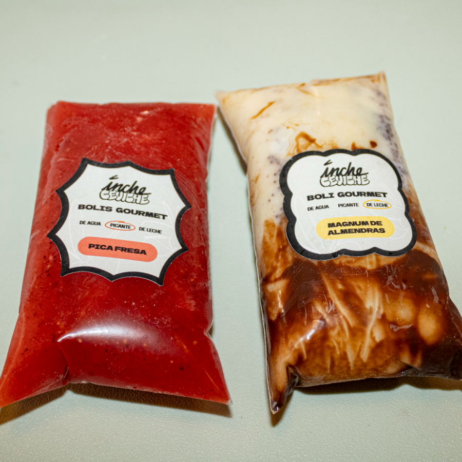 Hielito congelado en bolsa con jugo de frutas sabor piña y fresa.