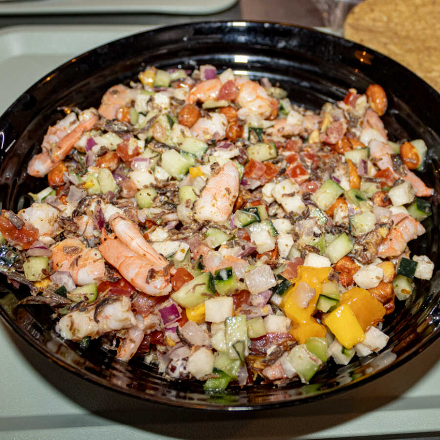 Camarón con carne seca, cacahuates, pepino, jitomate y cebolla, bañado en jugo de limón, aderezo, salsa y tamaño a elegir, incluye 3 tostadas de maíz.