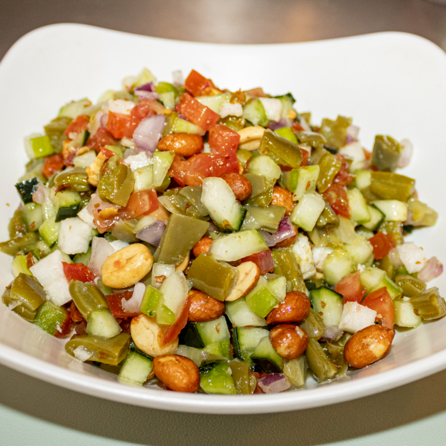 Ceviche con pepino, jitomate, cebolla, nopal, cacahuate, base de la casa, aderezo, salsa y tamaño a elegir, incluye 3 tostadas de maíz.
