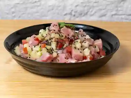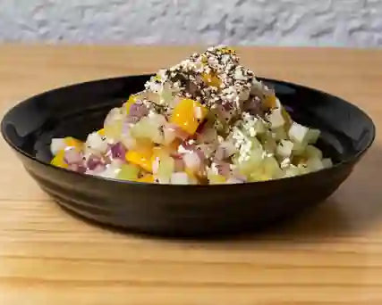 Ceviche con pepino, jitomate, cebolla, atún, base de la casa, aderezo, salsa y tamaño a elegir, incluye 3 tostadas de maíz.