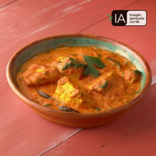 Queso panela con una deliciosa salsa de curry de espinaca. Foto creada con AI.