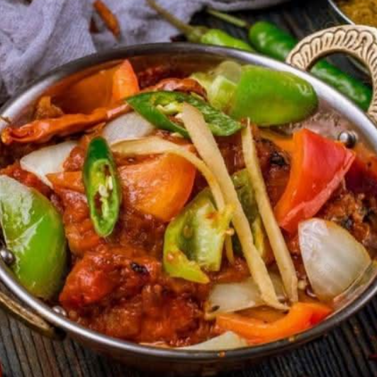 Pollo cocinado en curry amarillo con pimientos y cebolla.