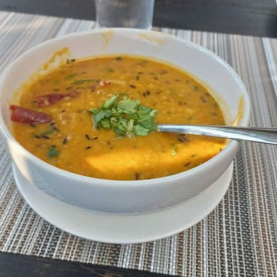 Lenteja amarilla cocinada con cebolla, jitomate y mantequilla.