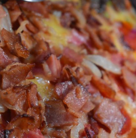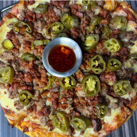Base de queso manchego, mozarella y gouda con trozos de tocino, cebolla, jamón y pepperoni. *Tocino: ch 230gr. | med 330gr. | gde 450gr.* *Pepperoni: ch 20gr. | med 30gr. | gde 40gr.* *Jamón: ch 10gr. | med 40gr. | gde 60gr.*